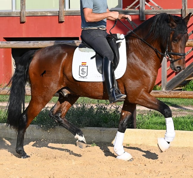 Dieser 2020 geborene, reinrassige PRE Hengst (Andalusier mit Rassenachweis der ANCCE), ist ein richtiges Powerpaket der nur so vor Elan bei der Arbeit strotzt! Er kommt von einem liebevollen Züchter, wo Spätentwickler wie die Spanier, das bekommen, was sie wirklich brauchen- Zeit! So ist er bis 3 in der Hengstherde komplett roh gestanden, wurde dann kurzzeitig aufgestallt, um die Basics zu lernen und dann wieder in den Urlaub entlassen, um alles mit Zeit zu verarbeiten. So hat er aktuell eine gute Basis unter dem Sattel, wo besonders darauf geachtet wird, dass er gut zu differenzieren lernt, zwischen seinem Vorwärtsdrang und Ruhephasen unter dem Reiter. Er lernt immer besser, sich selbst zu tragen, sich zu strecken und Ruhephasen zu verlängern, was sehr schön zu sehen ist. Ein Pferd, dass nicht in der Ausbildung gehetzt wurde, sondern sich erst finden darf und lernt die Energie zu lenken. Und Arbeitswillen hat er ohne Ende! Wo anderen schnell die Puste ausgeht, gibt er mehr und ist unermüdlich, womit er bestimmt ein Ideales Pferd für sehr ambitionierte Reiter ist, die gerne regelmäßig und gezielt trainieren. Geritten wird er auf doppelt gebrochener Wassertrense und ist nur an den Vorderhufen beschlagen. Nachts lebt er auf einem Hengstpaddock, was seinem Kopf auch sehr gut tut und tagsüber ist er in der Box für fürsorgliche Pflege und die korrekte Fütterung ist so besser garantiert. Ausritte auf dem hektargroßen Areal tun ihm auch gut und man merkt richtig, wie er da in seine Mitte findet, als positive Abwechslung zum Viereck. An leichten Arbeitstagen geht er in die Führmaschine und wird auch so weiter bemuskelt, ohne Gewicht zu tragen. In seiner Abstammung finden wir Ausnahmehengste wie YACO de TORRELUNA, ERMITAÑO III und sein Bruder ist sehr erfolgreich in der Dressur und hat es sogar zum SICAB (Weltmeisterschaft der PRE) geschafft. Er hat noch nicht gedeckt und kennt es, in der Nähe von Stuten zu sein, wobei die Option der Kastration vor Ort, selbstverständlich besteht. Aktuell misst er 157cm und hat ein schön barockes Exterieur, mit einem feinen Spanierkopf und guten Bewegungen, die ihn für viele Sparten mit hohem Arbeitsniveau interessant machen. Preiskategorie E-F! Sein Standort ist Menorca. Videos und Abstammung gerne auf Anfrage. Gerne organisiere ich vor Ort eine AKU, Beritt, Kastration, Transport oder auch ihre Reise, sollten Sie persönlich zum Anschauen kommen. Details dazu gerne auf meiner Seite oder im Gespräch. Saludos aus Spanien