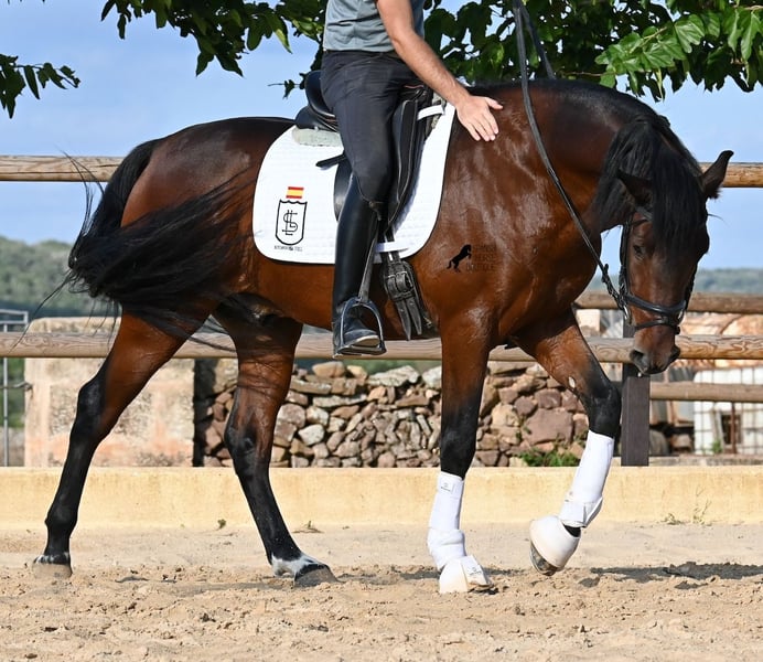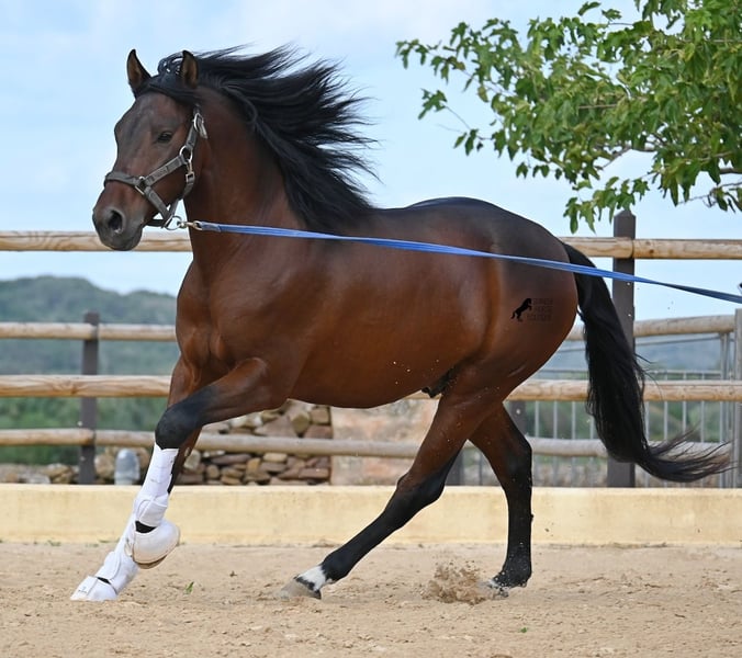 This 2020-born, purebred PRE stallion (Andalusian with breed certification from ANCCE) is a real powerhouse, bursting with energy at work! He comes from a loving breeder who understands that late developers like the Spaniards need what they truly require—time! Thus, he remained completely raw in the stallion herd until the age of 3, was then briefly stabled to learn the basics, and subsequently sent back to relax and process everything at his own pace. Currently, he has a solid foundation under saddle, with a particular focus on helping him learn to differentiate between his forward drive and relaxation phases under the rider. He is increasingly learning to carry himself, stretch, and extend his relaxation phases, which is wonderful to see. This is a horse that has not been rushed in training but has been allowed to find himself and learn to direct his energy. He has endless willingness to work! While others quickly tire, he gives even more and is tireless, making him an ideal horse for very ambitious riders who enjoy regular and targeted training. He is ridden in a double-jointed snaffle and is only shod on his front hooves. At night, he lives in a stallion paddock, which is very beneficial for his mental well-being, and during the day, he is in a box for attentive care, ensuring proper feeding. Trail rides on the hectare-sized area are also good for him, and you can really see how he finds his center as a positive change from the arena. On light workdays, he goes into the lungeing machine and continues to build muscle without carrying weight. In his pedigree, we find exceptional stallions such as YACO de TORRELUNA, ERMITAÑO III, and his brother is very successful in dressage, even reaching the SICAB (World Championship of the PRE). He has not yet covered any mares and is accustomed to being near mares, with the option for castration available on-site, of course. He currently stands at 157 cm and has a beautifully baroque conformation, with a fine Spanish head and good movements, making him interesting for many disciplines with a high level of work. Price category E-F! His location is Menorca. Videos and pedigree available upon request. I would be happy to organize an examination, training, castration, transport, or even your trip should you wish to come and see him in person. Details can be found on my page or in conversation. Greetings from Spain!