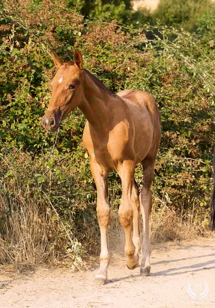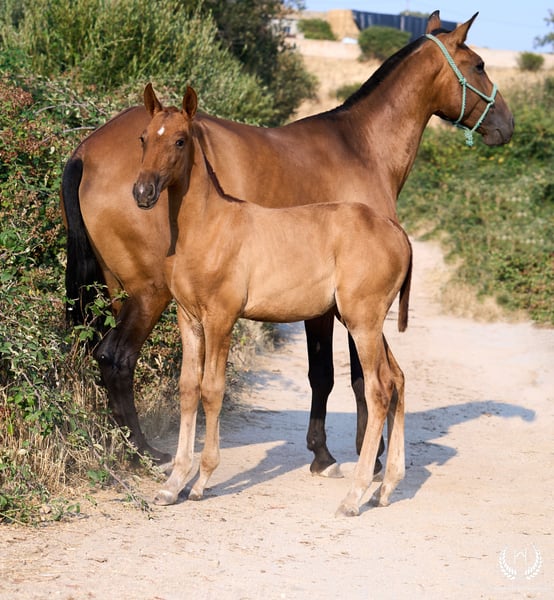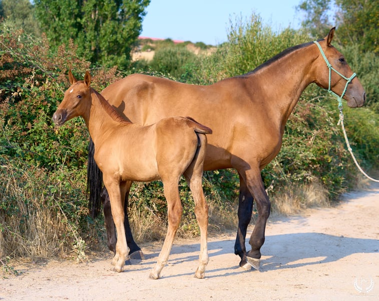 🏇 Ambar is an impressive Pura Raza Española (PRE) filly with a chestnut coat (ee), a white star on her forehead and another on the upper lip, with exceptional genetics. Registered with ANCCE, she is homozygous for the extension gene (ee), the well-known “little e”. Red mane and tail. 📆 Born on 27 May 2025 🧬 Outstanding PRE genetics: ♀️ Dam: Triana CCCXVI, a 1.70 m PRE mare, daughter of the great Deimos (1.80 m) from the prestigious Hnos. Tejedor Fdez. stud. Deimos is a grandson of Educado X (Hnos. Salvador Guardiola Fantoni), a Qualified, Improving and Elite Stallion, one of the most influential names in modern PRE breeding. ♂️ Sire: Pellon – Yeguada Militar “Pellon” is a black stallion born in 2016 at the Military Breeding Centre of Écija, standing 1.64 m tall. He stands out for his beauty, nobility and exceptional willingness to work, qualities he consistently passes on to his offspring. His genetics are impeccable: on the sire line he descends from Velero XI, one of the few stallions recognised by ANCCE as a Qualified Breeding Stallion and Young Recommended Breeder, a reference in sport; on the dam line he descends from Cepellon and Lego, as well as Lebrijano III and Bizarro XIV, some of the most important reproducers of the Yeguada Militar. Pellon has over 58 registered offspring, consistently producing elegant, functional and very expressive foals with top-level morphology and temperament. 🏆 Sporting potential and exceptional genetics: Ambar has everything to become an outstanding filly: impeccable breed morphology, convex profile and head, wide, functional and powerful movements, an exotic and highly valued coat, and a sweet, very easy temperament. Her pedigree guarantees quality and a strong future. 🩺 Health guaranteed: Any veterinary examination is accepted. Filly raised in freedom, perfectly socialised and well balanced within the herd. ✈️ National and international transport: We work with the best specialised equine transport companies. Request your quotation with no obligation.
