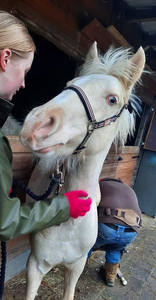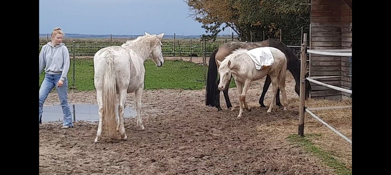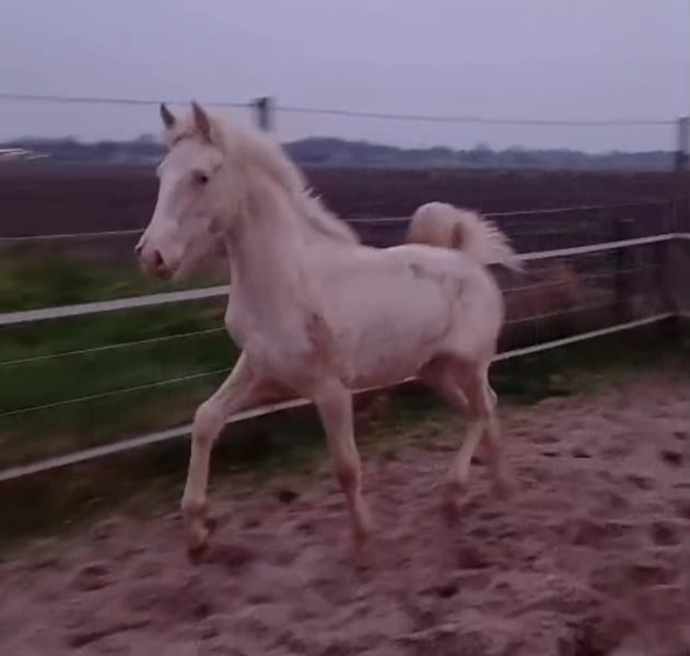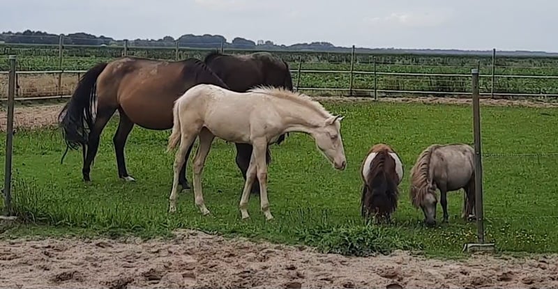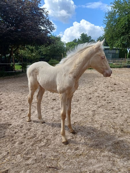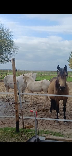Onze Lucia Dorada doet haar naam eer aan met haar uiterlijk en gouden karakter. Ze is dan ook opzoek naar een gouden huisje. ⭐️🏡 Ze is geboren op 02.05.2025 en hinnikte al toen ze nog half in het vlies lag. Inmiddels is ze net bij haar moeder vandaan. Het is een ontzettend aanhaalderig en levendig veulen die het liefst de hele dag gekriebeld wordt. Ze heeft een zeer sterk beengebruik en zal hierdoor later zeer geschikt zijn voor de sport, al zal dit door haar mooie cremello kleur nog extra opvallen. Ze is inmiddels 2 keer bekapt, al lijkt het alsof ze dit al jaren gedaan heeft, zo braaf. Ook halster omdoen op stal of buiten is geen probleem. Verder is ze al netjes ontwormd. Haar Andalusiesche moeder is een donkere valk en haar vader net als haar een cremello. Ze is later dus ook zeer geschikt om een mooi gekleurd veulentje mee te fokken. Haar beide ouders zijn rond de 1.50m, maar haar moeder fokt behoorlijk groot, wat haar dus ook best een grote e pony kan maken. Wij zoeken echt een goed en veilig huisje voor haar, waar ze mag opgroeien samen met andere vriendjes. De vraagprijs is €2750,-