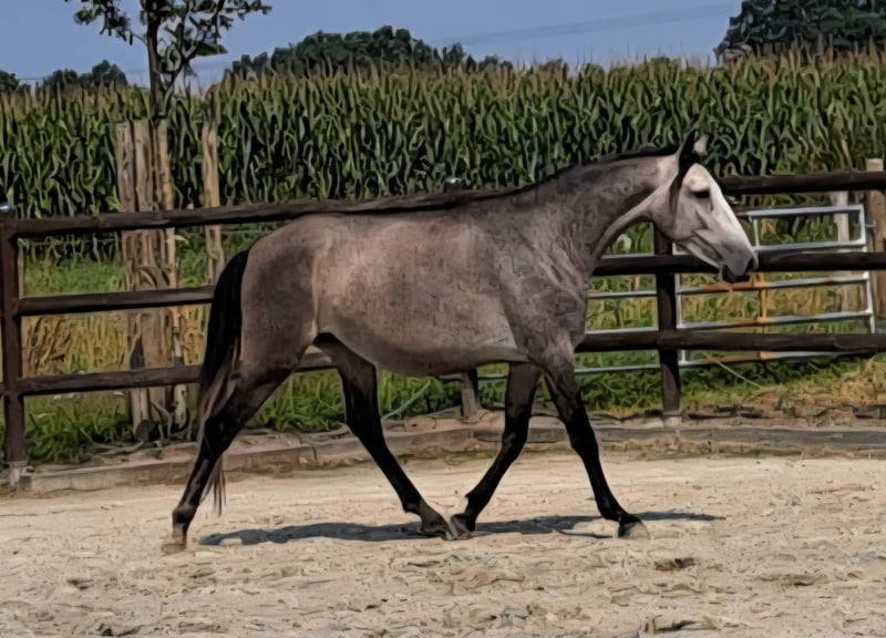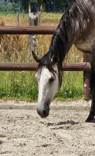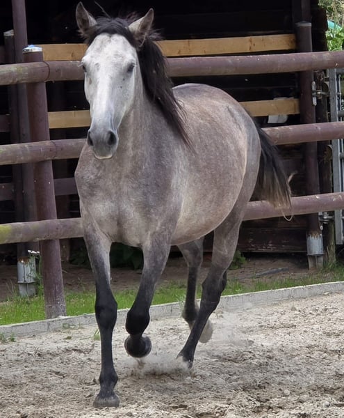 Caña, a nearly 4-year-old typical Andalusian mare. She was born with us and has always grown up in a herd and on large pastures. Still unbroken, she gives her hooves and is very well-behaved and uncomplicated to handle. Final height approximately 155 cm +-. She can either stay for further training or move directly to her new home. Serious inquiries are welcome!!