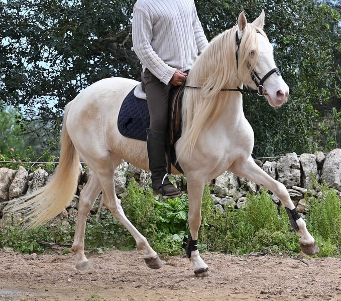 Diese 2020 geborene Andalusierstute (PRE Eltern, sie hat einen Equidenpass) ist ein wahres Juwel. Ihr traumhaftes Aussehen mit den stechend blauen Augen und der langen Mähne, zusammen mit ihrem femininen Exterieur, machen sie zu einer wahren Augenweide. Doch sie ist so viel mehr, als nur schön! Seit Dezember 2019 ist sie erst unter dem Sattel und stand bis dahin wie ein Wildpferd in der Stutenherde. Diese lange Zeit, die sie hatte um einfach ein soziales Pferd zu sein, hat sie auch im Kopf reifen lassen. Denn sie lernt unfassbar schnell und hat sich in kürzester Zeit sehr an ihren Reiter gebunden. Mit nur 153cm Stockmaß ist sie nur leider zu klein für ihn, um für immer zu bleiben. So wird für sie ein Zuhause gesucht, wo man so mit ihr umgeht, wie sie es gewohnt ist- mit viel Liebe, Zuwendung und schonendem Training. Sie wurde schön an der Longe bemuskelt, bevor es unter den Reiter ging, das sieht man besonders an der tollen Halsung, die auch mit dem Gewicht der langen Mähne, stark ist und nicht zur Seite neigt. Es werden ihr immer wieder Momente am langen Zügel angeboten und nichts wird mit hast gemacht. Am Reitplatz war sie keine 5x unterm Reiter, es geht immer ins Gelände, inklusive Baden im Meer und bis zu 3h unterwegs, wo sie einfach unermüdlich ist! Unfassbar ist, wie extrem mutig und unerschrocken sie ist. Ich habe sogar ein Video, wo eine riesige Baumaschine an ihr vorbeifährt und sie stolziert unerschrocken vorbei, als wäre nichts! Radfahrer und Autos von vorne und von hinten- sie marschiert! Und das auch mit Energie, denn sie hat viel Tatendrang und man muss sie an die Ruhe erinnern, denn sie will einfach vorwärts. Wobei sie immer sanft ist, selbst wenn man im Galopp die Zügel komplett loslässt. Für Geländereiter ist sie jetzt schon eine ideale Partnerin, wenn man ein wunderschönes Pferd im Sonderlook mit großem Herzen und unermüdlicher Lust zu marschieren sucht. Für alle die auch gerne im Viereck unterwegs sind, müsste sie noch etwas mehr in der Biegung und Anlehnung gearbeitet werden, aber mit ihrem Charakter, wird sie auch das schnell lernen. Die Zähne wurden vor Kurzem gemacht, sie geht vorne beschlagen und hinten barhuf und ihren Alltag verbringt sie im Offenstall mit anderen Stuten. Ein fabelhaftes Pferd mit viel Potenzial zu einem mehr als fairen Preis! Videos und Abstammung gerne auf Anfrage. Ihr Standort ist Mallorca. Gerne organisiere ich vor Ort eine AKU, Transport oder auch ihre Reise, sollten Sie persönlich zum Anschauen kommen. Details dazu gerne auf meiner Seite oder im Gespräch. Saludos aus Spanien