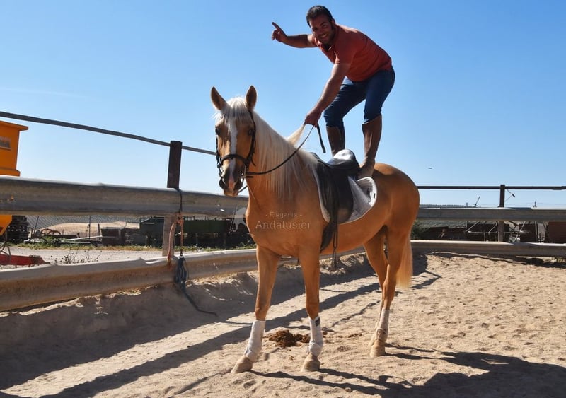 cher caractère, monté aux allures de base, est dehors avec d'autres juments, couleur spéciale www.elegante-andalusier.com