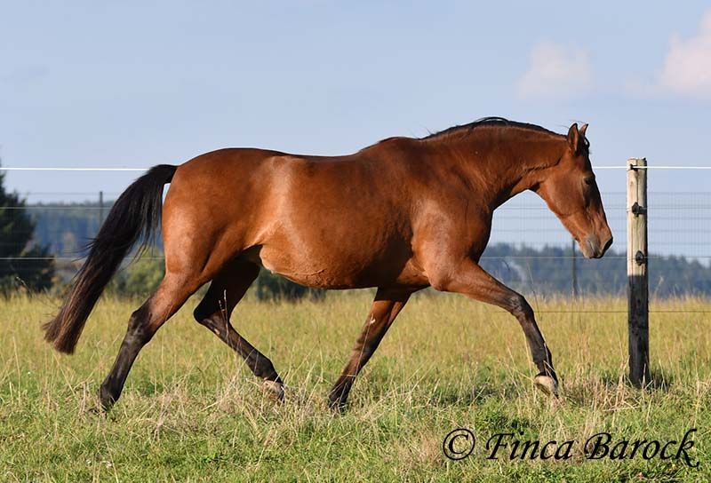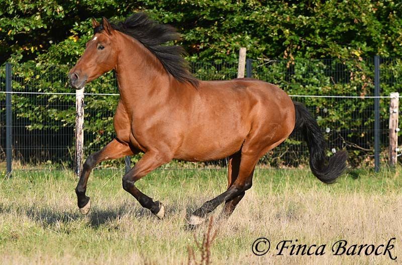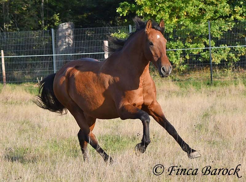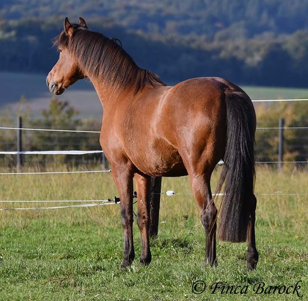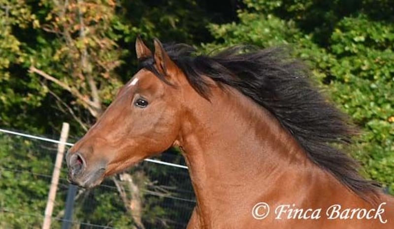 Breed: Andalusian Name: Terry Gender: Gelding Height: 16.1 hh (165 cm) Age: Born July 12, 2009 Color: Brown Price: Price on request Sire: Unknown Dam: Unknown Terry, our comfortable riding professor with a big heart and lots of charm! Terry has been in one owner’s hands for the past 8 years and is only being offered for sale due to his owner’s pregnancy. He is up to date on vaccinations, regularly seen by the dentist, and a lot of suitable tack can be included. He has been barefoot for years and handles outdoor riding well. Terry is well-mannered, affectionate, and friendly in handling. Occasionally, he looks for treats, but he quickly learns there are none available. He loves being out on rides, whether alone or in a group. In many situations, he remains very confident—crossing motorway bridges, splashing through puddles, working in the forest, passing creaking wind turbines—Terry simply goes past without hesitation. In dressage, he is solidly trained. He is familiar with walk-trot, walk-canter transitions, and can perform flying changes. Shoulder-in and travers are very good; traversal movements are well underway and steadily improving. Terry also has a fantastic uphill canter and very comfortable, seat-friendly movements. A good, active walk is part of Terry’s repertoire. During a training session with Diana Krischke, he was also asked for some piaffe steps, which he performed with great motivation. He would definitely benefit from further training in this area. Terry is also used to being ridden by children and less experienced riders. He is well-behaved and forgiving of rider mistakes. Overall, however, he prefers a confident rider. If the rider is distracted by every sound, Terry will notice it too. But if the rider simply continues riding, nearby noises don’t bother him much. He is accustomed to herd life and active stable routines. He enjoys company and is generally good-natured, but prefers his own box and quiet at night. Terry is the perfect dream horse for anyone looking for an experienced partner who is both confident in the terrain and possesses solid dressage training. Contact: Finca Barock, Tel. 0173-696 31 81, 56291 Wiebelsheim