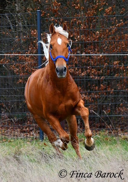 Breed: Andalusian Name: Yucatan Gender: Gelding Height: 15.6 hh (156 cm) Date of Birth: February 1, 2020 Color: Palomino Price: €9,900 Sire: Unknown Dam: Unknown Yucatan, our compact, friendly boy with a blonde coat. He is affectionate and alert in handling, and enjoys spending time with his human. Yucatan has been extensively ridden in the field and feels completely at ease there. He is used to both riding alone and in groups, exploring the terrain confidently. He has a lovely, expressive walk with good ground coverage and holds his own well alongside larger horses. He is familiar with traffic, dogs, and cyclists. He also handles younger horses well and confidently passes unfamiliar objects without hesitation. In the arena, he knows the basics and is being further trained by us. Yucatan prefers a rider who doesn’t push too hard; he tends to stop if pressured too much. With normal aids, he moves forward willingly. He is comfortable sitting and enjoys working actively. His uphill canter is particularly noteworthy. Besides riding, Yucatan loves free lunging work. He also enjoys circus-like exercises and shows great willingness to learn. He has quickly learned to lie down and we have also started working on Spanish steps. A wonderful boy with a lot of charisma and an excellent character, showing great versatility and enthusiasm for new tasks. Includes veterinary examination and X-ray images. Contact: Finca Barock, Tel. 0173-696 31 81, 56291 Wiebelsheim