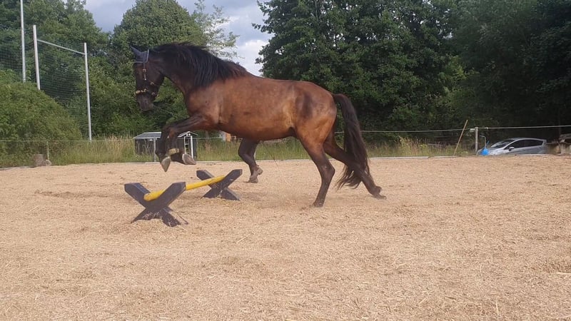 This clever 8-year-old gelding has been ridden in his leisure time and is currently being gradually brought back into work after an injury-related break. Checo loves liberty work and small tricks; he’ll do almost anything for treats. He is familiar with introductory double longeing and groundwork exercises (shoulder-in, hindquarters-in) and is also comfortable riding alone in the terrain. Checo has experience in open-stall management within a gelding group (preferably higher-ranking), and it would be wonderful if he could find a similar home again. He is well-behaved in handling but, typical of his breed, can sometimes be a bit lively, so he’s not suitable for absolute beginners. Checo has participated in extreme trail courses at his current stable and has also attended a working equitation clinic off-site. He measures approximately 15.1 hands and is an Eczema sufferer, but he does not require blankets or similar. Currently, he sports a mane band due to this (see last photo). He also has a small sarcoid on his side. His price is approximately 3.5 to 4 carrots 🥕🥕🥕, but we are open to negotiations. All tack and accessories can be purchased together if desired. If interested, I am happy to provide further information. We look forward to getting to know him! 😊
