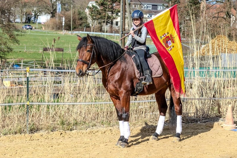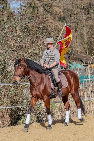 Zum Verkauf steht unser 9-jähriger, dunkelbrauner Andalusierwallach mit einem Stockmaß von 1,65 m. Der Wallach ist dressurmäßig gut ausgebildet und wird sicher vor der Kutsche ein- und zweispännig gefahren. Er ist verkehrs- sowie geländesicher und zeigt sich dabei immer zuverlässig und ausgeglichen. Unproblematisch beim Schmied und verladen. Im Umgang ist er freundlich und unkompliziert. Er wird von unseren Kindern mitgeritten und eignet sich sowohl für den Freizeitbereich als auch für den ambitionierten Sport. In der Herde ist er sozial und gut verträglich. Weitere Informationen gerne auf Anfrage. Besichtigung und Probereiten/fahren nach Terminvereinbarung möglich.