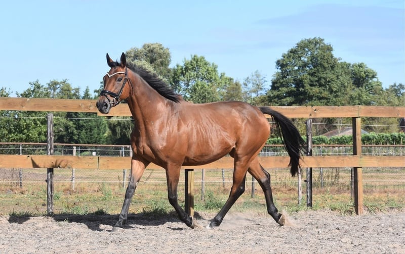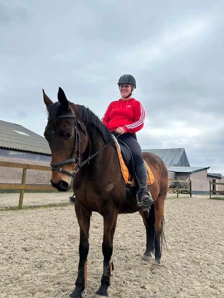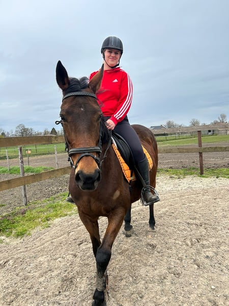 Meet Sarah, a beautiful 12-year-old mare standing approximately 1.60 m at the withers. She is by Flemensfirth out of Ability To Burn and has a lovely, well-bred dressage build with a gentle, friendly head. When Sarah arrived with us, she was not afraid, but a bit cautious around people. We quickly noticed that she simply needed some time to build trust. In the meantime, she has fully blossomed and now shows her sweet nature. In the stable and at the grooming area, she often stands happily with her ears pricked forward, curious about what you're doing. She enjoys attention and certainly doesn’t refuse a cuddle. We have also ridden her again, and she takes it in stride as if she has never stood still. She is easy to handle and resumes work nicely. Sarah is a lovely mare for someone who wants to continue working with her and build a bond. Who will give this sweet mare her new home? Price: €3,950 – including brand saddle