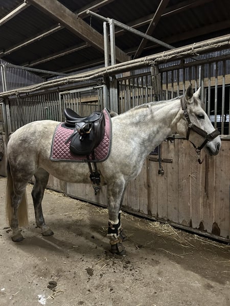 Due to my retirement from competitive riding, I am reluctantly offering my mare “Twiggy 4,” affectionately called TWIX, for sale. Twix has been in my possession for the past 6½ years. Prior to that, she competed in dressage up to Level A*, show jumping up to Level A**, and cross-country jumping also up to Level A*. However, I have not actively competed with her. The only time she was shown was once in 2020 in class E. Her passion lies in jumping, especially in cross-country courses. She has not been actively jumping cross-country for about two years. Twix has a lot of scope and can become quite energetic both in jumping and during trail rides. Therefore, she is not suitable for beginners. In handling, she is very gentle. She also enjoys free jumping and quickly learns commands such as parking at the mounting block or the Spanish walk. HEALTH STATUS: Twix has melanomas on both sides of her cheeks. She has had these for approximately two years, and they have not grown in that time. The melanomas have been examined at a veterinary clinic and do not affect her. However, it cannot be completely ruled out that they might grow in the future and potentially interfere with her dressage work. Since I have owned her, she has had no colic, coughing, or similar issues. She is kept on pasture during the day and in a paddock during winter, with overnight stabling. Previous owners kept her in box stalls, as well as in open and active stabling. She is regularly dewormed, vaccinated, and has seen the dentist and osteopath. She is barefoot. Twix loads without any issues. No dealers or riding schools. Price is negotiable; place before price. Includes accessories (jumping saddle, dressage saddle, blankets, etc.). For inquiries, please contact me via WhatsApp :) +49 179 4392301 Videos available upon request.