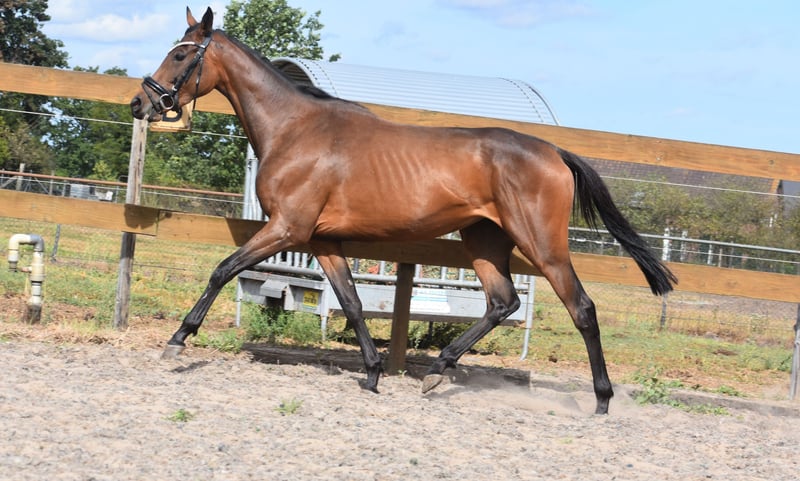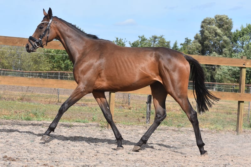 Here is Yvy, a stunning young mare aged 3.5 years with an approximate height of 1.55 meters. She is by Doyen out of Little Nugget. She has a chic, elegant build and is sure to attract attention the moment you enter the stables. She has a very sweet and honest appearance. Yvy has three fantastic gaits, making her suitable for multiple disciplines. Despite her young age, Yvy handles work here very well. She enjoys working with her rider and makes every effort to understand everything as best as possible. Currently, she is being ridden dressage and recreationally and shows a good attitude and a lot of potential. She is completely sound and free of any faults. Comes with a very recent inspection report, including blood test. Price €3,950 – including brand saddle and saddle pad.