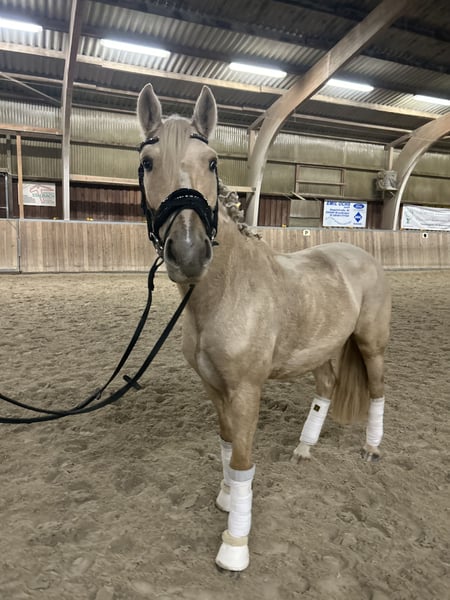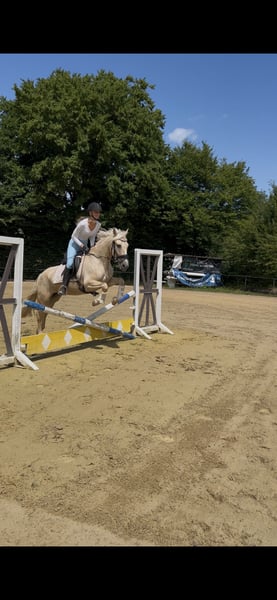 Unsere bezaubernde Palomino-Stute (4 Jahre, ca. 1,47 m) sucht ein liebevolles Zuhause, in dem sie mit Geduld, Zeit und Vertrauen in Ruhe weiter gefördert wird. Sie ist ein Pferd mit viel Herz, Charme und Charakter – eine echte Persönlichkeit, die ihren Menschen fürs Leben finden möchte. Diese Stute ist menschenbezogen, verschmust und sehr aufmerksam. Sie liebt es, im Mittelpunkt zu stehen, sucht Nähe und möchte gefallen. Dabei braucht sie jemanden mit Erfahrung, Gefühl und Geduld, der ihr Sicherheit schenkt und sie liebevoll, aber konsequent führt. Hat sie einmal Vertrauen gefasst, geht sie mit ihrem Menschen durchs Feuer. Sie befindet sich derzeit auf einem soliden A-Niveau in der Dressur und zeigt dort wie auch am Sprung viel Freude und Talent. Sie arbeitet gerne, lernt schnell und möchte gefordert werden – Stillstand ist nichts für sie. Ihr erstes kleines Turnier im Führzügel hat sie mit Bravour gemeistert, und auch im Gelände zeigt sie sich mutig, interessiert und nervenstark, solange sie Rückhalt von ihrer Reiterin bekommt. Sie lebt derzeit im Offenstall in gemischter Herde, wo sie sich sozial zeigt, aber ranghöher steht. Auch Boxenhaltung kennt sie. Sie ist gesund, robust, regelmäßig entwurmt, dem Schmied vorgestellt und läuft barfuß ohne Probleme. Ein echtes Herzenspferd mit Ausstrahlung und Arbeitsfreude Viel Potenzial für Dressur, Springen oder vielseitige Freizeitgestaltung Sehr menschenbezogen, sensibel und lernwillig Auch als Zuchtstute interessant Auf Wunsch kann ein passender Sattel gegen Aufpreis miterworben werden Ein Probereiten ist nach Absprache möglich (Gebühr 25 €). Die Stute wird ausschließlich in liebevolle, fördernde Hände abgegeben, da sie bei uns ihr Potenzial nicht voll entfalten kann. Sie ist kein Pferd für jedermann – aber das perfekte Pferd für den Menschen, der ihr Herz gewinnt.