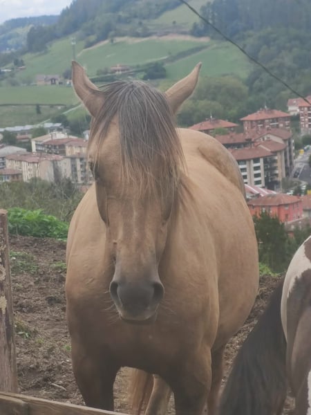 Te presento a Luna, una yegua Luso-árabe (75%-25%), palomina tostada de imponente presencia (capa poco común). Sobre el 1'55m de alzada y de complexión fuerte. En edad perfecta para domar, 6 años. Esta ramaleada y acostumbrada al trato humano.