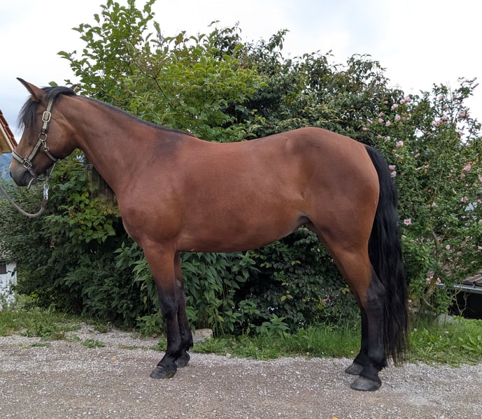 Very brave, beautiful mare, height approximately 140 cm, absolutely fearless in all situations one can imagine in road traffic and elsewhere, completely relaxed. Suitable for someone who enjoys groundwork or leisurely walks and rides at a walk. Due to ataxia, she is not suitable for higher riding demands. Otherwise, she is fit, requires no medications or treatment, is very easy to care for, and is not sensitive regarding feeding and housing. I am happy to send videos on the lunge and more photos.