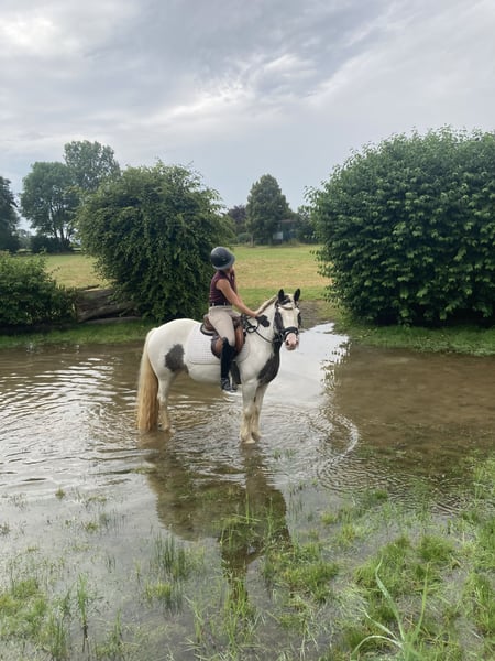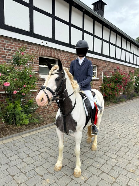 We are selling our mare "Buttercups" because she is not ideally suited for riding lessons on a permanent basis. If a beginner loses their balance, gets tense, or holds on to the reins, she becomes anxious and can start galloping. She is a very friendly pony and wants to do everything right. She has competition experience in rider competitions, show jumping, and the Caprilli test (currently placed!). She moves well in the herd and also goes nicely in front or alone. She can be ridden bareback, enjoys riding outdoors, and is easy to groom and lead. She has not been longed with us. Accessories can be purchased at a small additional cost. She is shoe and loading friendly. She is barefoot. Since July 2023, she has been with us (imported from Ireland), and has been dewormed three times a year and vaccinated against tetanus and influenza. Buttercups lives with us in a small open stable but can also be kept in a box stall without any issues. She is suitable for children and teenagers who have a relaxed riding style. The rider's fear can transfer to the mare. She has been ridden and jumped by children aged 9 to 17. We are looking for a loving home for this adorable pony!