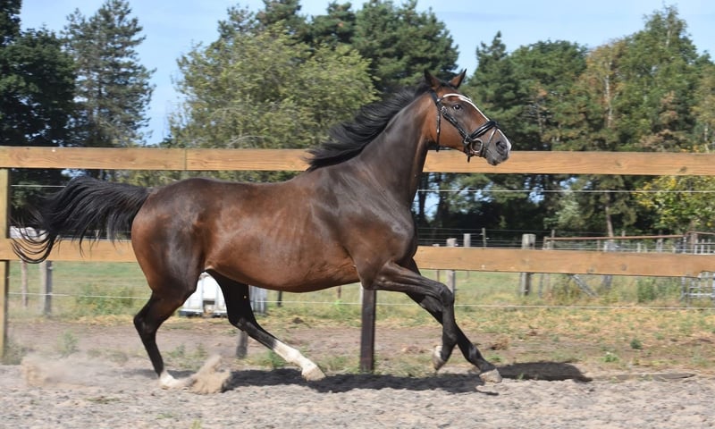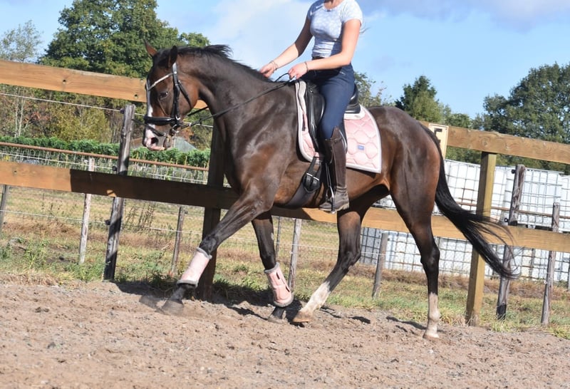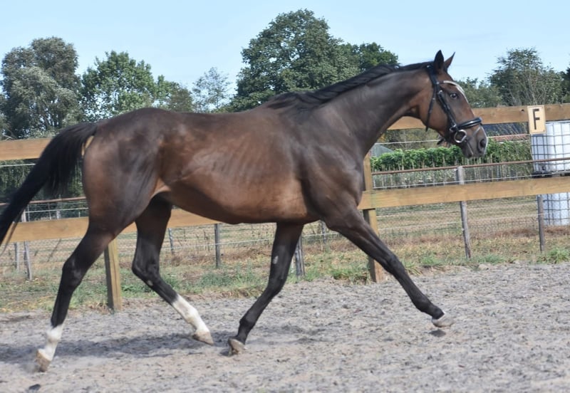 Paddy est une jument de 9 ans d’environ 1,62 m, issue d’un élevage de Leading Light x Caoba par Hernando (FR). Elle possède une silhouette élégante mais solide, avec de belles longues jambes, et se montre agréable à monter. Paddy n’est en aucun cas paresseuse et aime travailler pour son cavalier. Elle a une bouche douce et réagit délicatement aux aides, sans nécessiter une main lourde. Elle est habituée au trafic, en bonne santé et sans défauts. Elle est également très intéressante pour l’élevage ! Récemment, elle a été traitée chez le vétérinaire-dentiste. Prix : 5950 € (TVA incluse), avec selle de marque et couvre-rein.
