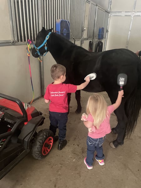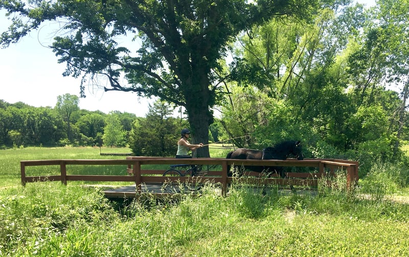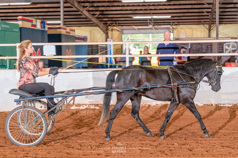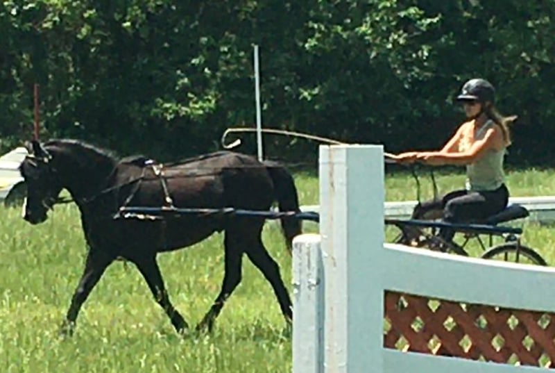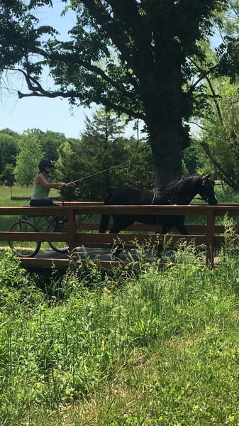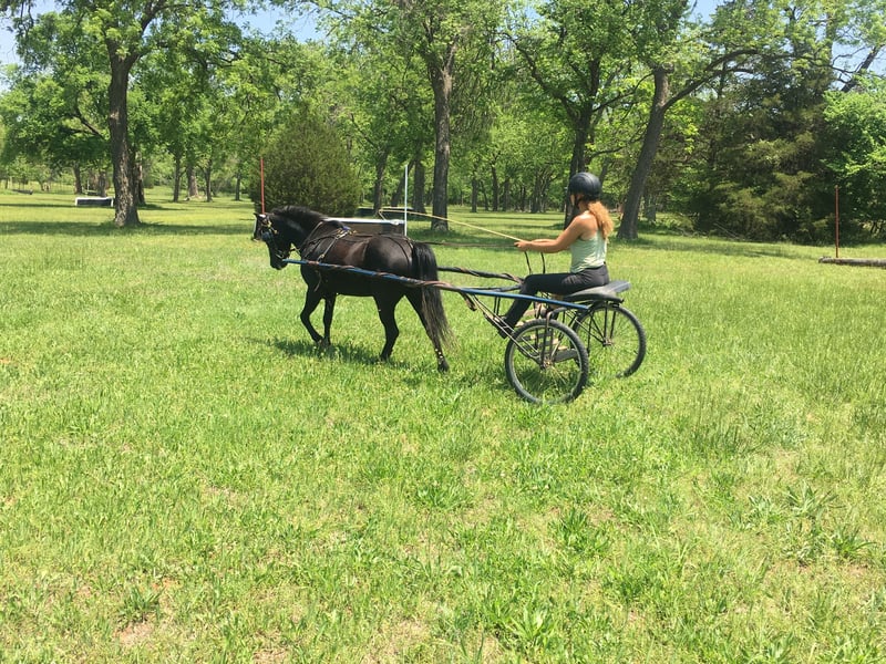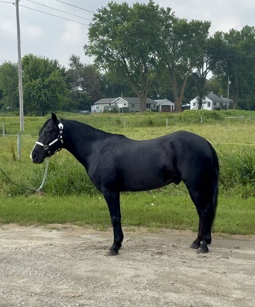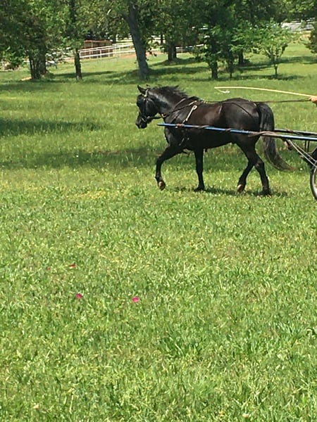 "AVAILABLE ON ONLINE HORSE AUCTION AT www DOT MagicHorseAuction DOT com BIDDING OPEN NOW thru TUESDAY | AUGUST 19TH! - BUY IT NOW AVAILABLE! *Final price will be determined on auction site* CONSIGNOR CONTACT INFO: Melissa Montgomery 918-409-7484 LOCATION: Rochester, MN "Ollie is a cute, cute, cute 7 year old black pony with blue eyes. He stands 11.3-12 hands and is sound in every way. Dubbed “the cutest thing I’ve ever seen” at every show he’s been to, he will catch the judge’s eye every time. He has been brought along slowly from age three by small adult riders, but we put a little kid on him regularly. We have been super careful not to overwork him in his training; we’ve chosen to bring him up, teach him something, maybe go to a local show and then turn him back out for some months. He’s been in professional training for the hunter ring and he never refused a jump. He’s also comfortable in the english and western dressage arenas and he’s done a little bit of cross country jumping and trail riding. Plus, he was broke to drive by a professional trainer and has driven cross country! He would excel with a young person who’s got a little bit of experience, but he’s also cantered the grandchildren(age 7)around on the lunge line. He’s been back in training for the grandchildren for the last three months and now he’s sadly offered for sale because Daddy is still in school and Mommy is expecting their third baby! We can’t fault Ollie in any way except that he does not get treats from the hand (or he won’t leave you alone), and he needs reasonable fly control in his stable to control biting flies. He loads, clips and stands for the farrier. His dental care and vaccinations are up to date.