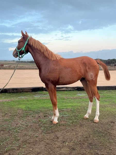 For sale: 17-month-old colt with exceptional movement that is beyond the ordinary. He has a striking coat, a somewhat exclusive chestnut color with a star and a blaze (he is just starting to develop a more uniform chestnut coat). His sire is a purebred Arabian, trained in vaquero dressage, while his dam is a proven three-quarter Thoroughbred mare also trained in vaquero dressage and classical dressage! Sire’s height: 159 cm at the withers Dam’s height: 163.5 cm at the withers The colt measures 154 cm at the withers!