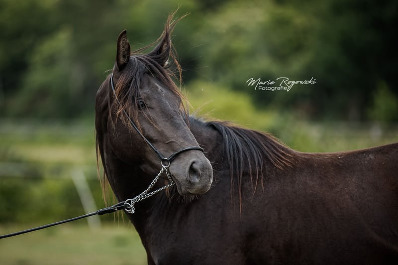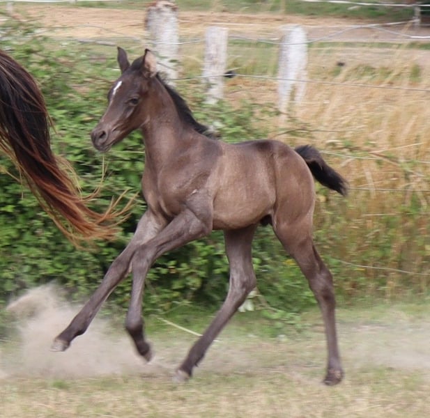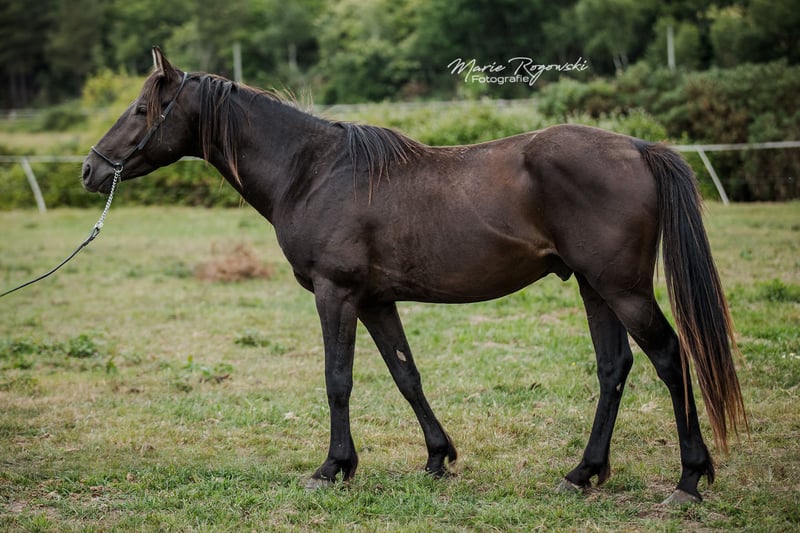 Anglo-Arabisch, AES papieren grootboek (+ IFCE registratie), Smoky-zwart (heterozygoot crème gen) geboren op 26 juni 2020 vandaag (4 jr.) ca. 153 cm, 154-156 cm eindhoogte. geweldig sportpaard vooruitzicht, veelzijdigheid ... stabiele, compacte verschijning. Beweegt goed, groeide op in kudde buiten in veulen groep, goed met halster, leidtouw, blote voeten verzorging, laden, reizen. Basistraining grondwerk. Niet koppig - leeft 24/7 buiten op de stoeterij in grotere hengstengroep met oude hengst. Blote voeten, ontwormd, gevaccineerd. Mooie verschijning, ook geschikt voor kleinere ruiters. Fotogalerij: 2024 - 2022 - 2021 - 2020. Zeer interessant qua fokkerij: correcte lijnen, vader een van de weinige volbloeden ter wereld in de kleur smoky cream (dubbel verlicht zwart), moeder uit de Champagne foklijn van Falkenhorst Stud (Gwendolyn Gregorio). Vader en grootvader zijn ook te bezichtigen op de stoeterij. Zeer gunstig wegens inkrimping van onze voorraad. Vanwege het overlijden van de fokker een absolute "limited edition GG". Bieden. Particuliere verkoop zonder garantie of teruggave. Persoonlijke afhaling heeft absoluut de voorkeur, accommodatie gratis beschikbaar. De prijs ... het symbolische bedrag van één euro is NIET de verkoopprijs. De verkoopprijs is afhankelijk van de koper en andere contractuele afspraken. Hier kan de koper punten scoren in zijn (of uiteindelijk het paard) voordeel door goede verzorging en/of een plek om te wonen (geen doorgeefluik). Alle dieren zijn alleen beschikbaar op persoonlijke presentatie.