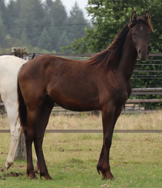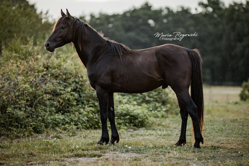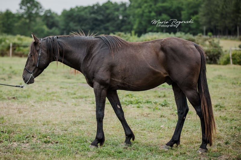 Anglo-Arabian, AES papers ledger (+ IFCE registration), Smoky-black (heterozygous cream gene) born on June 26, 2020 today (4 yrs.) approx. 153 cm, 154-156 cm final height. great sport horse prospect, versatility ... stable, compact appearance. Moves well, grew up in herd outside in foal group, good with halter, lead rope, barehoof care, loading, traveling. Basic training ground work. Not stubborn - lives at stud 24/7 outside in larger stallion group with old stallion. Barehoofed, dewormed, vaccinated. Beautiful appearance, also suitable for smaller riders. Photo gallery: 2024 - 2022 - 2021 - 2020. Very interesting in terms of breeding: correct lines, sire one of the very few thoroughbreds in the world in the color Smoky-Cream (double lightened black), dam from the Champagne breeding line of Falkenhorst Stud (Gwendolyn Gregorio). Sire and grandsire can also be viewed at the stud. Very favorable due to reduction of our stock. Due to the death of the breeder an absolute \"limited edition GG\" Offer. Private sale without warranty, guarantee or return. Personal collection absolutely preferred, accommodation available free of charge.