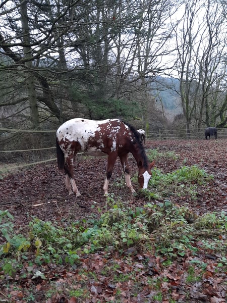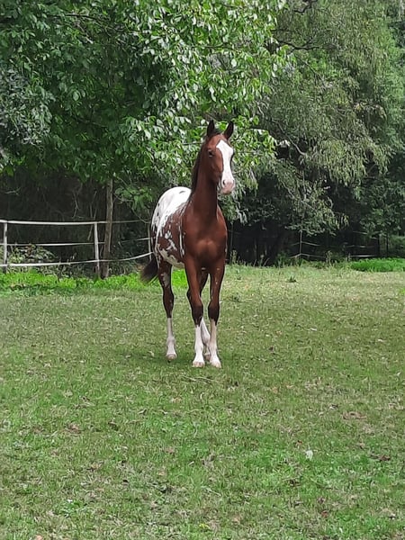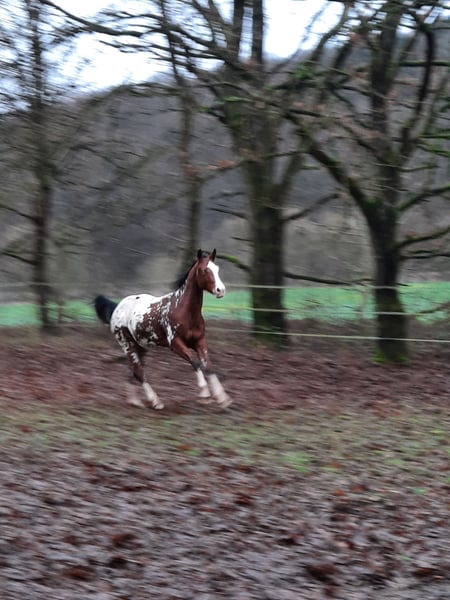 Nomen est Omen: Karma impresses not only with his stunning appearance but also with excellent movement in all three basic gaits. He has a correct conformation paired with plenty of frame. He embodies the modern sport horse type and will undoubtedly mature into a large rider’s mount. At just 20 months old, he already measures 1.55 meters at the withers. He is herd-friendly, well-behaved in handling, familiar with trailer loading, and knows the basics of foal training. He is farrier-friendly and eager to receive further training. He is being sold directly by the breeder. Karma has ApHC registration papers and is registered with the ApHCG. He was the national champion of his foal crop.