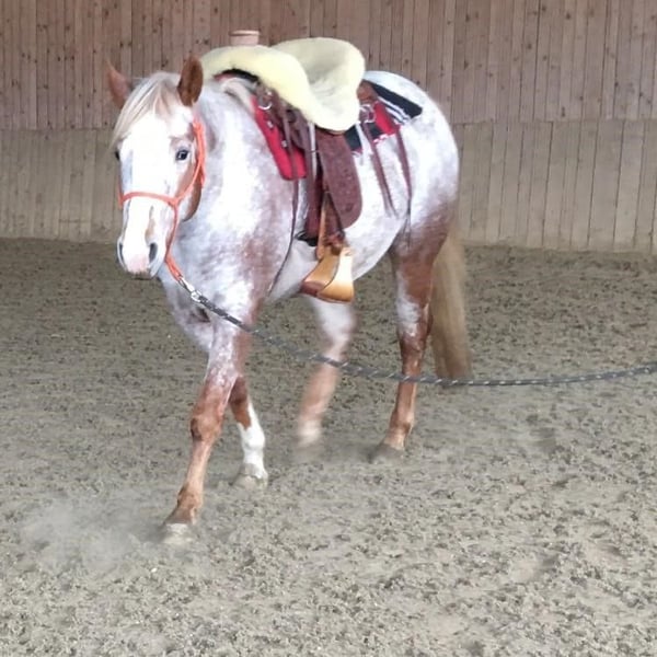 Cette douce jument Appaloosa enregistrée, née en 2015, avec un profil génétique 5 panels N/N, de couleur rouge (roan/vernissage, génétique de la couleur : ee/Aa, LP/lp, PATN1 n/n), a été poulinière ces dernières années et m’a offert plusieurs magnifiques foals. Elle est excellente en travail à la longe, intelligente et facile à manipuler, très orientée vers les humains et amicale avec les enfants. Elle a suivi un léger entraînement en selle par le passé, a été monté, mais n’a pas encore été dressée, avec une base marche – trot. Elle est encore verte sous la selle et nécessite des leçons. Elle a simplement besoin de plus de temps en selle. Il n’est jamais trop tard pour un nouveau départ ! La mère de Katy a également participé à son premier concours à l’âge de onze ans (le concours Appaloosa Show CR), où elle a remporté le Grand Championnes et la 1ère place en Showmanship ! Elle possède une conformation correcte et une tête magnifique. Elle mesure 1,54 m au garrot, avec un corps solide, adaptée aussi pour des cavaliers expérimentés. Son pedigree inclut MA Thunderstorm, Doc O’Lena, High Sign, Bonanza Royal, Bright Eyes Brother, Mighty Bright, Joker B., Mansfields Comanche, etc. Pour plus d’informations, n’hésitez pas à me contacter ou à consulter ma page : appaloosa.sk Vous êtes les bienvenus pour venir nous rendre visite !