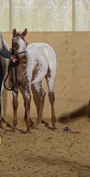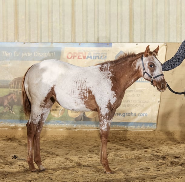 Zum Verkauf steht eine wunderschöne Appaloosa Stuten, geboren im April Jahr 2025. Mit einem geschätzten Stockmaß von 152cm ca. ist sie die ideale Partnerin für Western-Reiter, die auf der Suche nach einem vielseitigen und charakterstarken Pferd sind. Molly kennt schon den täglichen Alltag mit Halftern , führen auf die Koppel , anbinden , putzen , Tierarzt, Hufschmied usw . Traktoren , Motorsägen, Rotwild Diese Stute zeichnet sich durch ihr freundliches Wesen und ihre Lernbereitschaft aus. Sie ist gut erzogen und möchte immer gefallen . Ihre auffällige Fellzeichnung macht sie zu einem echten Blickfang. Sie eignet sich sowohl für den Freizeitbereich als auch für den Turniersport ist natürlich auch sehr interessant für die Zucht ( LP/LP Trägerin vererbt somit immer bunte Fohlen ) Bei Interesse oder für weitere Informationen stehe ich gerne zur Verfügung. Auf dem Bundeschampionat 2 platziert!! Plaudit San Molly ( LG 1 prämiert ) Ca 151 Sire: Cowboys Spoted San DAM: Charmys Purpel Rose Farbe Sorrel Fohlen ist 5 Panel doppelt NEGATIV über die Elterntiere Geimpft, regelmäßig entwurmt!! Registriert beim APHCG und APHC …. E Pass von APHCG und Orginal COR von APHC✅ Kommt nur in beste Hände , ⭐️⭐️⭐️⭐️⭐️ Sterne zuhause !!!