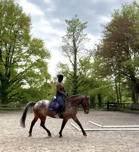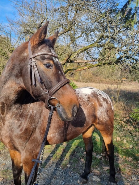 Spirit ist ein 13 jähriger Appaloosa-Araber-Mix. Er ist 1,60 m groß und stabil gebaut. Spirit ist ein cleveres Kerlchen, der Beschäftigung in jeder Form liebt. Gern geht er ins Gelände, geht mutig voran, lässt sich aber auch hinten oder in der Mitte reiten. Spirit hat viel Pepp und möchte gern jeden Tag bewegt und ausgelastet werden. Dressurmäßig ist er auf auf A/L Niveau. Seitengänge im Schritt und Trab sind abrufbar. Er kann bei korrekter Hilfengebung sehr schön in Beizäumung gehen und macht eine schicke Figur dabei. Stangenarbeit und springen kennt Spirit auch, wobei schon kleine Hindernisse gern höher nimmt und natürlich bei hohen Sprüngen dann zur Hochform aufläuft. Für geübte Springer ist er eine Freude, da er den Willen hat drüber zu kommen. Spirit ist ein Pferd welches sich sehr gut auf die Energie des Reiters einstellt und sich dementsprechend reiten lässt. Er möchte gerne von den Reiterhilfen begleitet und eingerahmt werden. Wir haben Spirit vor 3 Jahren von privat für unseren Reitbetrieb gekauft. Er hat keine Probleme mit wechselnden Reitern und unterschiedlichen Reitniveaus. Wir setzen ihn gern in den Dressurstunden und bei Ausritten ein. Auch bei den Anfängern, die noch zu zweit im Schritt reiten, ist er super brav und bemüht. Für Galopp- und Springanfänger ist er leider zu fleißig und engagiert. Und genau deshalb haben wir uns entschieden für ihn ein besser passendes Zuhause zu suchen. Unser Reitbetrieb entwickelt sich seit diesem Jahr mehr in die Richtung des Anfänger-Unterrichts und wir merken, dass Spirit unterfordert ist und viel mehr in ihm steckt, als wir von ihm brauchen. Deswegen möchten wir ihm jetzt, wo er noch so jung ist, eine Chance geben einen passenderen Menschen zu finden, der ihn fordern und fördern kann. Spirit steht bei uns in einer gemischten Herde und ist mit allen sehr verträglich. Er ist sehr verspielt und freundet sich mit jedem an ohne dominant zu sein. Wir geben Spirit Heulage, da er mit unserem Heu hustet. Die Vorbesitzer hatten mit Husten keine Probleme. Im Sommer trägt Spirit wegen der empfindlichen Appaloosa-Augen dauerhaft eine Maske, was ihm sehr gut gegen die UV-Strahlung hilft. Im Frühling, Herbst und Winter hat er keine Maske an. Wir können uns Spirit nach wie vor in einem pferdegerechten Reitschulbetrieb mit artgerechter Haltung vorstellen. Da wir Befürworter des Reitens ohne Hilfszügel sind, käme für uns auch nur ein Reitschulbetrieb infrage, der die gleiche Meinung vertritt. Wir können uns Spirit sehr gut in den fortgeschrittenen galoppsicheren Reitstunden vorstellen, sowohl in der Dressur als auch beim Springen. Weitere Infos und Fotos zu unserem Reitclub finden Sie auf www.reitclub-kronberg.de Wir sind auch auf Instagram zu finden: https://www.instagram.com/reitclub.kronberg?utm_source=ig_web_button_share_sheet&igsh=ZDNlZDc0MzIxNw==