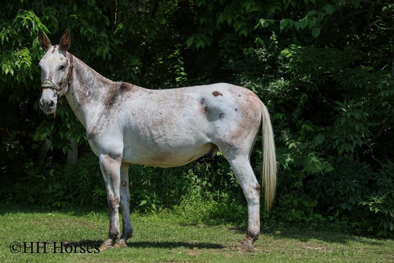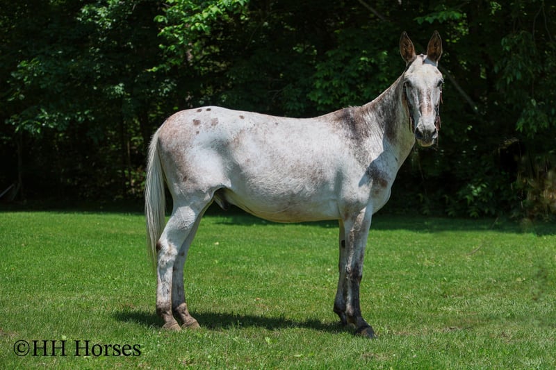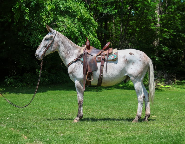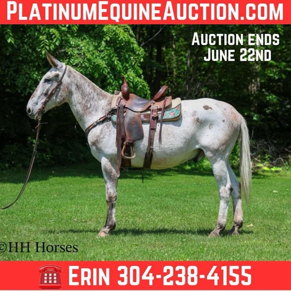 ONLINE AUCTION Place your bids at www.PlatinumEquineAuction.com Starting Bid $3500 Auction ends June 22nd, 2025 Need a new saddle? Check out White Rock Saddles on our website or Facebook! This is “NIGHTHAWK”, a unique colored, seasoned, well broke VARNISH ROAN APPALOOSA JOHN MULE that has been employed as a ranch mule and used for recreational trail riding. He has a true one hand neck rein, stops easily, and backs up. This mule is 15.3 hands tall, well built, and 12 years old. He has good bone and feet. He is sure footed in the mountains, lopes around nice in the arena, and is a solid trail mount. He will cross any depth of water without hesitation, he walks out nicely, and will lope off with no hump and no buck. He rides on a loose rein and is a nice mover that can cover ground smoothly. He has been used to push lots of cattle and ride in rough country. He is safe on the roads with traffic, he is not spooky, and he rides out alone with no issues. He stands to tack, mount, and groom. He picks up all four feet and handles his ears quietly. He is a really fun mule to ride that is comfortable, confident, and experienced. He will go anywhere you ask him willingly and he truly aims to please. Call H&R Horses Erin 304-238-4155 to make a Buy It Now Offer, to set up a time to come see him or if you have any questions. ONLINE AUCTION Place your bids at www.PlatinumEquineAuction.com Starting Bid $3500 Auction ends June 22nd, 2025 Need a new saddle? Check out White Rock Saddles on our website or Facebook!