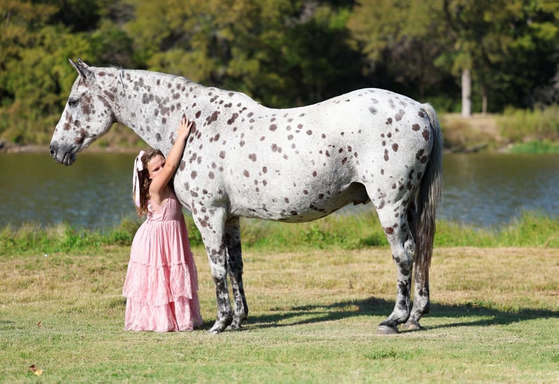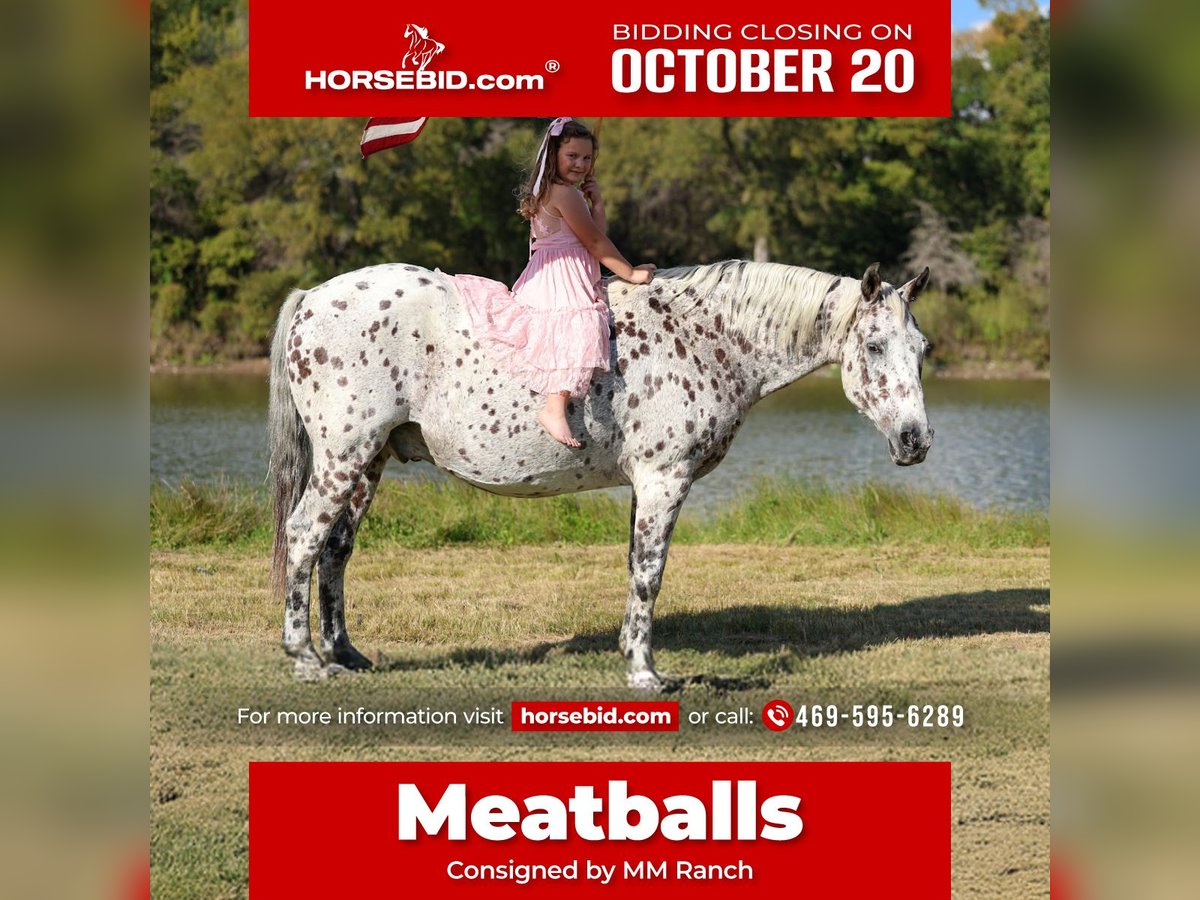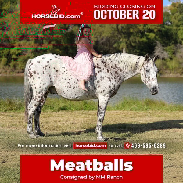 ♦️ 𝐭𝐡𝐞 𝐀𝐌𝐄𝐑𝐈𝐂𝐀𝐍 𝓕𝓪𝓵𝓵 𝓒𝓵𝓪𝓼𝓼𝓲𝓬 ♦️ Happening now thru MONDAY | OCTOBER 20th - Available EXCLUSIVELY on HorseBid's website! For more details and to register visit: www.Horsebid.com CONSIGNOR CONTACT: MM Ranch 469-595-6289 LOCATION: Forney, TX BREED: Appaloosa REGISTERED: No COLOR: Leopard Appaloosa HEIGHT: 15 AGE: 13 GENDER: Gelding Meatballs 🍝🍝 Meet Meatballs 🍝🍝 He is a rare hard to find type horse. One of those bombproof safe for anyone types. Anyone from 0-100 can ride him and enjoy him. Meatballs is a 13 yr old stunning leopard Appaloosa gelding that stands 15 hands tall. 🐆 He is spotted from his ears to his tail. 🍝👉🏼 Meatballs is one hand fancy broke with all the buttons, neck reins a circle each way perfectly, has a big stop and backs with ease. He will sidepass to open/shut gates as well. He takes both his leads every time, lopes perfect circles and does it with the reins draped loose while staying slow and correct the whole time, it’s as easy as riding a rocking chair! It’s a very smooth comfortable enjoyable lope. He has been ridden inside and out of the arena. Been shown in many 4-h and non pro classes. Been hauled to lots of local playdays. He does run the barrels (not at a pro level just for fun). He rides English as well and has done a little jumping. 🐂🐄 Meatballs has been ridden around the ranch and knows his way around cows as he has spent time working at a small feed yard, he has roped sick ones and loaded trucks at the stockyards. 🫶🏼👔 Meatballs is Mr. Personality, as friendly as they come, loves attention and is very calm natured! He is absolutely safe for any rider, small or large, young or old, beginner or novice, it makes no difference, anyone can ride Meatballs! He has been ridden by every member of our family all the way down to our 6 year old and we’ve trail ridden him double as well. 🚗 He has been ridden down the highways and he is traffic safe. He is great on trails and he will cross creeks, ditches, logs and navigate rough rocky areas. 🦃🦌 He has been exposed to all kinds of wildlife such as deer or turkey and will go anywhere that he is asked too. 🏔️ He has been ridden many miles in the mountains of Eastern Kentucky and encountered every obstacle possible on the trail. ⛺️ He has been on several week-long camping trips. He hauls well and picketline ties overnight. 🧗🏼 He will go up or down even the steepest slopes, across deep creeks, over downed trees, and over all types of rough terrain while still being sure footed. Meatballs has no bad habits at all! I mean not any at all!!! 🧠 He is as good minded and reliable as they come. He truly is a horse of lifetime and we want anyone that is interested in getting to know Meatballs to just give us call. He sells 100% sound. 📃 Will come with a brand new coggins and health certificate. He is up to date on all shots and vaccinations. 🌎 We can and will help arrange shipping if needed.