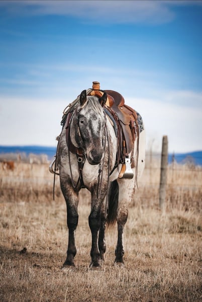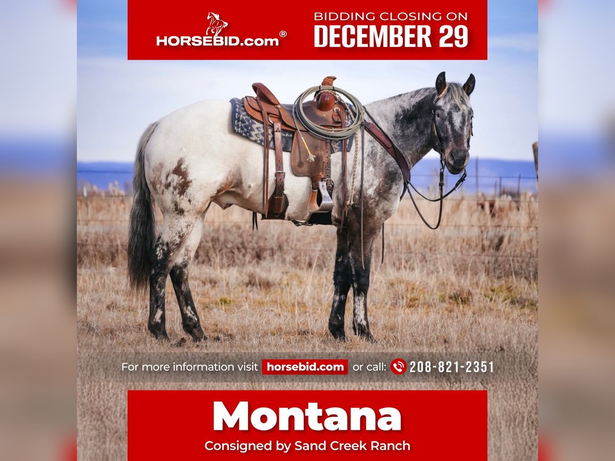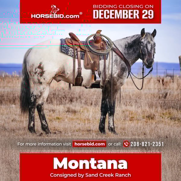 ⚜️ 𝓗𝓮𝓻𝓲𝓽𝓪𝓰𝓮 𝐖𝐢𝐧𝐭𝐞𝐫 𝓒𝓵𝓪𝓼𝓼𝓲𝓬⚜️ Happening now thru MONDAY | DECEMBER 29th - Available EXCLUSIVELY on HorseBid's website! For more details and to register visit: www.Horsebid.com CONSIGNOR CONTACT: Sand Creek Ranch 208-821-2351 LOCATION: Saint Anthony, ID BREED: Appaloosa REGISTERED: Yes REGISTERED NAME: BT Foxy Dream COLOR: Brown/White HEIGHT: 15.1 AGE: 3 GENDER: Gelding Montana is a coming 4 year old registered Appaloosa gelding. Not only does this guy have a full mane and tail but he is conformationally good looking and has the coolest looking color! He has always been an in your pocket gelding with a puppy dog personality. He is very friendly and enjoys being in peoples company. Montana will come over to the shake of a grain bucket or will be the first meet you at the gate. Montana is confident, quiet, and willing to please. He goes where he’s pointed and rides off alone or in a group. Montana will lope nice collected circles, has a good stop, neck reins and is starting to spin nicely. Montana is light in your hands and throughout his body. He will side pass move his shoulders, hind quarters and he will lay down on cue. Montana is sacked out to a variety of things, will go over a teeter totter bridge, noodles obstacles, tarps, big balls, ATVs, etc… anything new we’ve ever thrown at him he accepts with confidence and ease. Montana has been started on the hot heels. He also drug heavy logs and is no stranger to weight in the horn or seeing things on the end of a rope. Montana has been rode both in the arena and outside. He steps out nicely, on the desert and on the trails. He will cross logs and water with no problems. He is sure footed knows how to pick up his feet when navigating through various different terrain. Montana has been rode by a variety of riders and has handled them all with ease. Montana stands around 15.1 hands. He will pick up all of his feet, stand tied, trailers and hauls with no problem. This gelding has all the potential in the world, a solid foundation, and easy going personality. He sells with a current PPE.