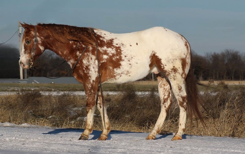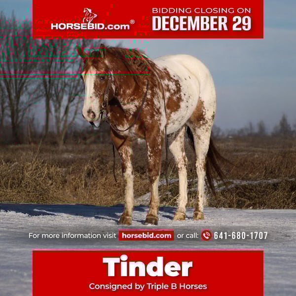 ⚜️𝐓𝐇𝐄 𝓗𝓮𝓻𝓲𝓽𝓪𝓰𝓮 𝐖𝐢𝐧𝐭𝐞𝐫 𝓒𝓵𝓪𝓼𝓼𝓲𝓬⚜️ Happening now thru MONDAY | DECEMBER 29th - Available EXCLUSIVELY on HorseBid's website! For more details and to register visit: www.Horsebid.com CONSIGNOR CONTACT: Triple B Horses 641-680-1707 LOCATION: Cincinnati, IA BREED: AHC REGISTERED: Yes REGISTERED NAME: Got An App For That COLOR: Appaloosa HEIGHT: 15.1 AGE: 4 GENDER: Gelding “Got an app for that” (A.K.A Tinder) is a 2021 model AHC gelding standing 15.1 hands tall. This gelding is as picture perfect pretty as you can ask one to be! Every where he goes everyone is turning heads and drooling over his good looks! Not only is he drop dead gorgeous but he GENTLE! He loves all the attention you will give him! His ground manners are impeccable! Tinder is easy to catch, stands tied, saddles easy, great for the farrier and vet. He is sooooo much fun to ride! Tinder is one hand broke, lopes collected circles, stops like a car that just got a brand new set of breaks! He is smooth in his transitions, side passes, and pivots. Tinder also knows how to side pass to the mounting block or anything you choose to use to get on! On the trails he will cross anything you put in his path! He is as sure footed as they come and has seen more miles on the trails than a Polaris ranger. He is familiar with the camping lifestyle and not spooky of anything that comes with that environment! Tinder has also been rode through town! We had everyone stopping us to come and pet him drooling over how pretty he is! Tinder has easily became the barn favorite and it’s no doubt why! He is the kind of gelding everyone can get on and enjoy! We were told he is started on the head side and coming along nicely but we have not personally roped live steer on him ourselves! Tinder is 100% sound and sane in every way! Please give me a call I would LOVE to talk about Tinder- 6416801707