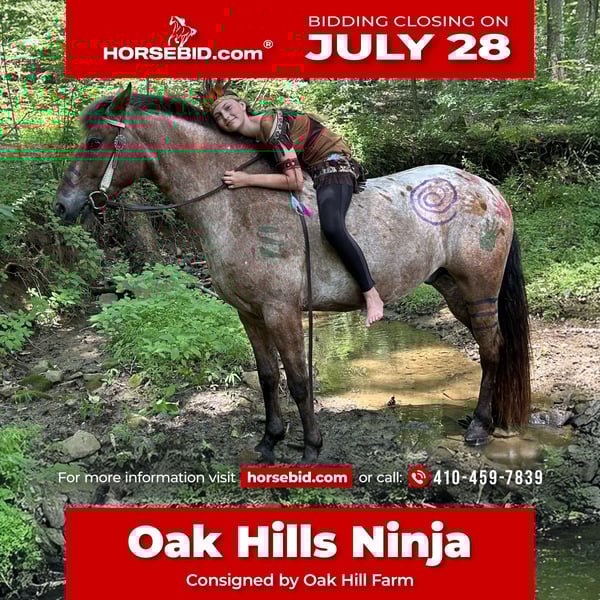 ⚔️ The HORSEMAN's Select ⚔️ Happening now thru MONDAY | JULY 28th - Available EXCLUSIVELY on HorseBid's website! For more details and to register visit: www.Horsebid.com Happening now thru MONDAY | JULY 28th - Available EXCLUSIVELY on HorseBid's website! For more details and to register visit: www.Horsebid.com CONSIGNOR CONTACT: Oak Hill Farm 410-459-7839 LOCATION: White Hall, MD BREED: Appy/Fjord cross REGISTERED: No COLOR: Bay HEIGHT: 15 AGE: 5 GENDER: Gelding Looking for your new best friend? The kind you can pull out of the stall and do anything with? Well look no further, meet Oak Hills Ninja. The happiest dude you will meet. He is a 5 year old 15 hand stout and sturdy Appy/Fjord cross gelding. Been with our family for over two years now and been ridden by us all!! Sadly he is looking for his new family as we aren’t using him as much and he is to nice to sit in the field. We know he will bring many smiles and adventures to someone else. Ninja has been nicely started under saddle in the ring he walk, trots and canters. Very comfortable gaits and has a good whoa on him. Loves to jump is very brave and honest. He has been to many cross country schoolings and has proven time and time again to be the leader and babysitter to all the youngsters. Rides in a snaffle with a nice mouth . My daughter has ridden him bridleless as well. Also neck reins We have taken this guy on lots of adventures and let me tell you he always shows up with his game face and a smile! Ninja has been used for pony club games rally and absolutely loved it! He won the 2024 Maryland region games rally and qualified for championships. Stood tied to the trailer all day long and took everything in stride. Played all kinds of games from hula hoops, hockey and popping balloons he was a trooper!! Another one of Ninjas absolute favorite things to do is fox hunt!! He loves every second of this. We used him as a whips horse and staff horse last season. Also hunted in the field with my daughter and has chaperoned kids on their ponies out hunting for the day. Each time he went out he proved to be the steady eddy one and always shined in the hunt field. Wonderful with the hounds all under him and with all the activity. Ninja is a trail machine as well and has put in many miles out and about. Will lead or follow. Crosses bridges, creeks and rough terrain. Not spooky or silly and loves to go. He also will go out alone never calls for his buddies and is just happy to be out with his human. Great with traffic, bikes, 4 wheelers and cars. He is 100 percent sound with no vices or maintenance. He has the best feet in the barn and is great for the blacksmith standing in cross ties. Never taken a lane step in the couple years we have owned him and comes with a clean PPE. Up to date on shots, Coggins, working and teeth. He has been well kept and is an easy keeper. Gets along well with others and been turned out in a mixed herd. Wonderful barn manners and stands in cross ties all day. Loves a good bath and always hops right up on the trailer. We are sad to see Ninja go and tears will be shed here but we know he will make another family as happy as he has made us. he is a lot of fun to have around you can pull him out for anything you want to do! Please feel free to contact Kelli Wells with any questions about Ninja would love to chat. Whoever gets this special guy will be lucky he has been a pleasure to have as part of our family.