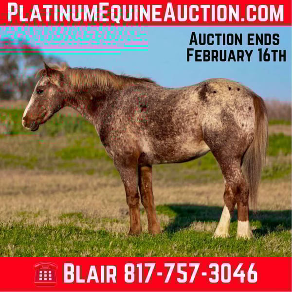 ONLINE AUCTION Place your bids at www.PlatinumEquineAuction.com Starting Bid $3500 Auction ends February 16th, 2025 Need a new saddle? Check out White Rock Saddles on our website or Facebook! Bambino aka “Bamb” is a 13.3H, 5 yr old Appaloosa gelding. Bamb is the cutest little step up pony for a handy youth or adult looking for something COMFY, small and fun! He is put together super correct and is one of the most handsome little app ponies we’ve ever represented! He has spent the last couple years as a handy kid playday horse, once they were ready for bigger performance horses, he moved on to a trail pony for a younger adult lady! Not many ponies have the handle this guy does! He’s broke like a seasoned big horse, very light to ride around, one hand broke and stops excellent! Bamb is EXTREMELY comfortable and has very floaty gaits! With a little more training, he’d easily make a little breakaway / rope horse prospect as he naturally wants to stop! He’d also be the perfect little rodeo horse for the handier kids wanting something fun and athletic!! Bambino goes the speed you ask, when you ask of him and is easy to ride and get along with. He’ll walk through water, and stays quiet on trails and in the arena. He’s happy to do any job you put him to and will go all day if you need. Bamb is NOT your typical “hot” pint sized jar of fun. He is calm, cool and collected and will never go faster than you ask! He’s NOT a “blown up” playday pony by any means. He’s very respectful and only really wants to please. Many horses his size are yee yawed around on by kids and as a result are hot and fractious to ride. NOT Bamb! He’s been rode by very respectful, handy kids that have rode him correctly! Being that he’s only 5, we do suggest an experienced rider only due to the fact he is pretty handy and athletic! He loads, leads, bathes, ties good and is UTD on feet, teeth and coggins! You don’t want to miss this unique opportunity to own an extremely put together, gorgeous little app gelding! Watch his video and go to his website page northtexashorsecompany.com/bambino for more pictures and footage! Please call Blair with North Texas Horse Company for more info at 817-757-3046. We LOVE to talk about him! We are located in Weatherford, TX and can help arrange affordable shipping to anyone!! ONLINE AUCTION Place your bids at www.PlatinumEquineAuction.com Starting Bid $3500 Auction ends February 16th, 2025 Need a new saddle? Check out White Rock Saddles on our website or Facebook!