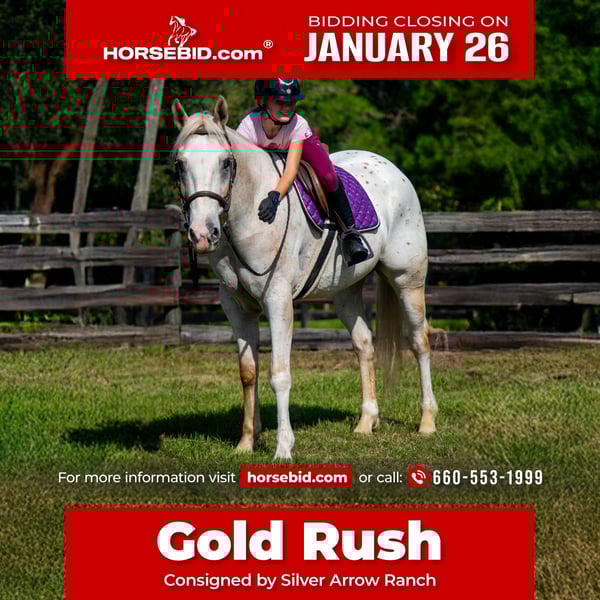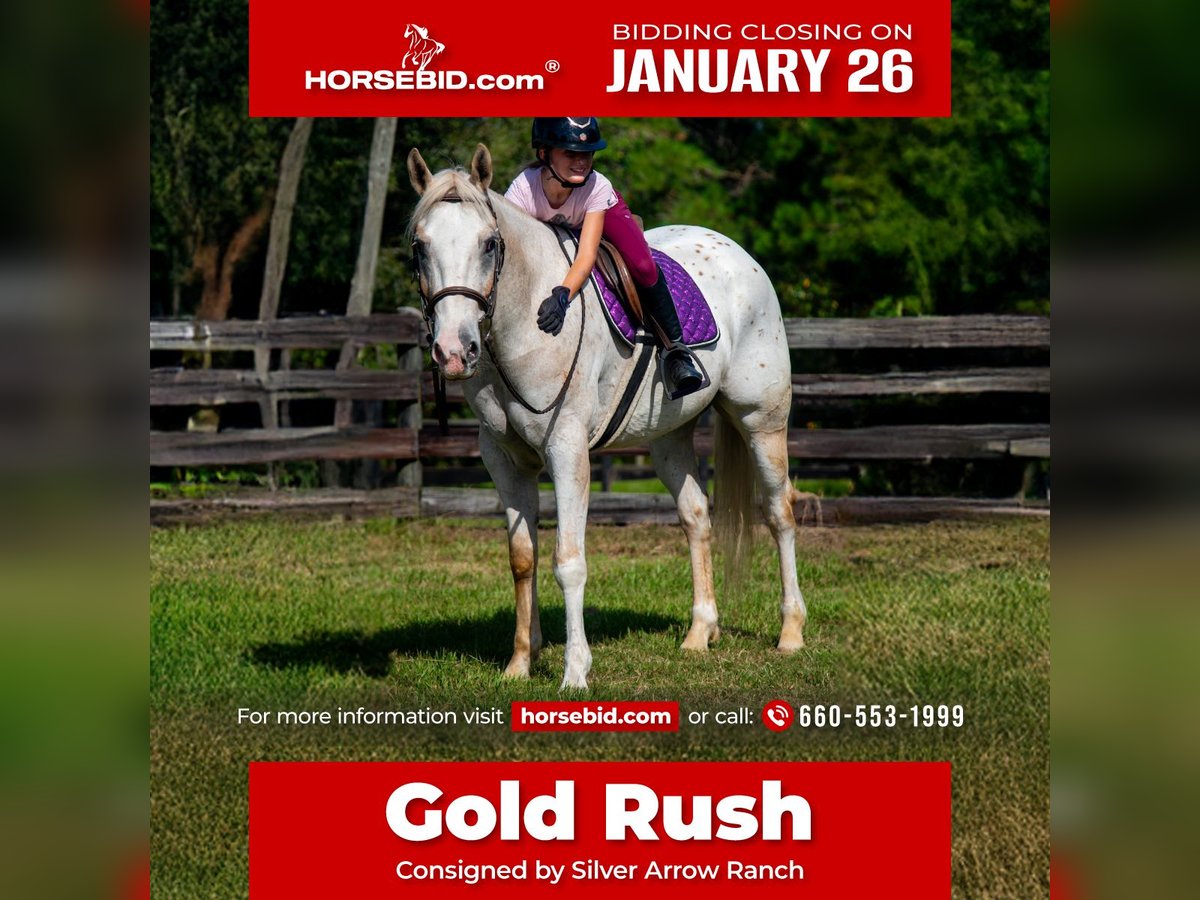 𝐉𝐀𝐍𝐔𝐀𝐑𝐘 ⭐️𝑨𝒍𝒍 𝑺𝒕𝒂𝒓 𝑳𝒊𝒏𝒆𝒖𝒑⭐️ Happening now thru MONDAY | JANUARY 26th - Available EXCLUSIVELY on HorseBid's website! For more details and to register visit: www.Horsebid.com CONSIGNOR CONTACT: Silver Arrow Ranch 660-553-1999 LOCATION: Ocala, FL BREED: Appaloosa REGISTERED: Yes REGISTERED NAME: Destinedtodazzleyou COLOR: Palomino HEIGHT: 15.1 AGE: 9 GENDER: Gelding Strike it rich with Gold Rush! “Rush” is a registered 2017 Appaloosa gelding that has what everyone loves….SPOTS!!! This spotted boy is everyone’s dream all around (Unless you have dreams of winning the Derby. He may come in a day later across the finish line.) Rush has done a bit of everything here. We have done obstacle courses, cross country, lessons, fun shows, and western fun days! He was also used in a beginner lesson program! He’s dabbled in some arena work in all tack and had fun schooling the jumps here at the house. He has impeccable ground manners and is always happy to see you in the morning. Rush is definitely more of a kick ride. The best part is he is smooth. No need to worry about a rough ride with him! Rush knows his leads and stays soft and supple in the bridle. Dont miss your chance to strike gold with Rush!