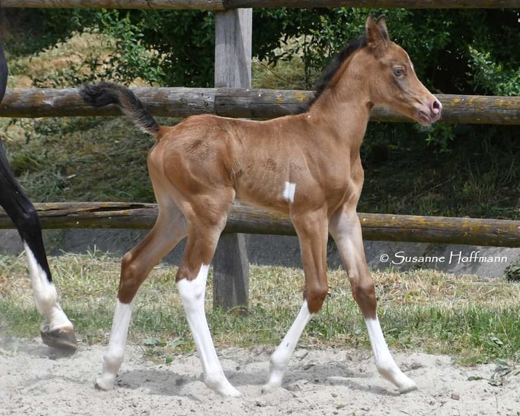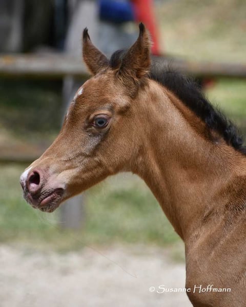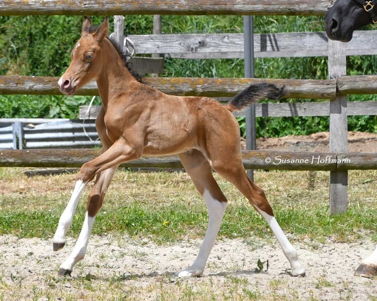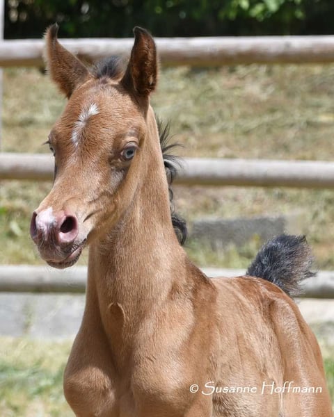 Unser Candyman ist ein absoluter Hingucker und etwas ganz besonderes, nicht nur wegen der seltenen, gold glänzenden Champagner Farbe und der Minimalscheckung, sondern auch weil er mit herrlichem Typ und Bewegungen vom Feinsten begeistert. Deshalb wurde er auch hoch prämiert, u.a. mit einer 9 für Typ. Wir würden ihn super gerne als Familienpferd sehen oder auch im Sport, z.B. in der Distanz . Denn wir sind uns sicher das er hier seinen Weg machen wird, schließlich stammt er aus sehr rittigen, leistungsbereiten Linien. Die Bilder zeigen ihn wenige Tage alt, dann kommen ein paar Bilder seiner Mutter und dann von seinem Vater.