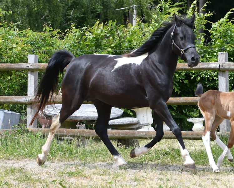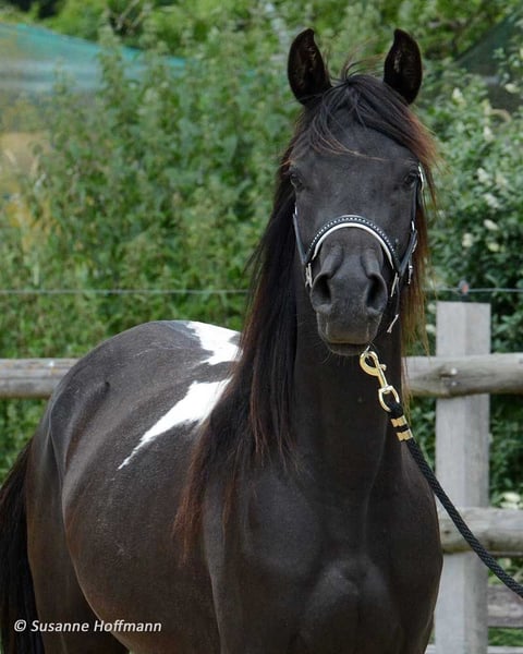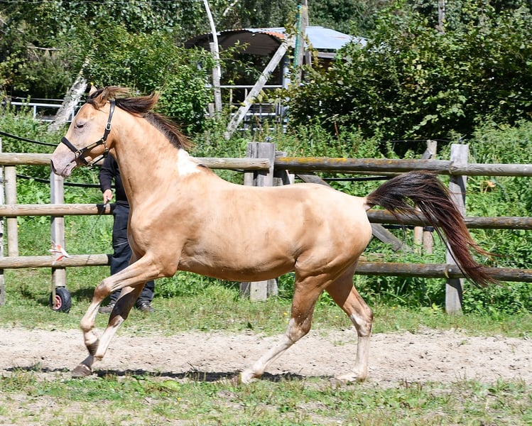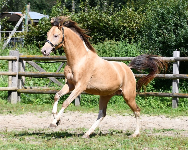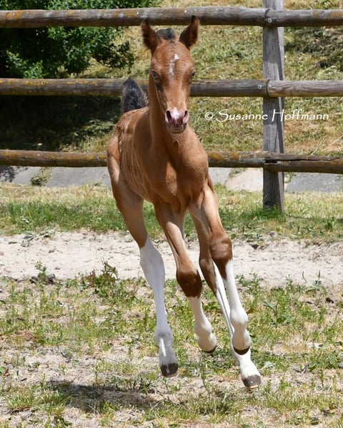 Our Candyman is an absolute eye-catcher and something very special, not only because of his rare, golden champagne color and minimal spotting, but also because he impresses with his wonderful type and top-notch movements. This is why he has also been highly awarded, including a score of 9 for type. We would love to see him as a family horse or also in sports, for example in endurance. Because we are sure that he will make his way here, as he comes from very rideable, performance-oriented lines. The pictures show him a few days old, followed by a few pictures of his mother and then of his father.