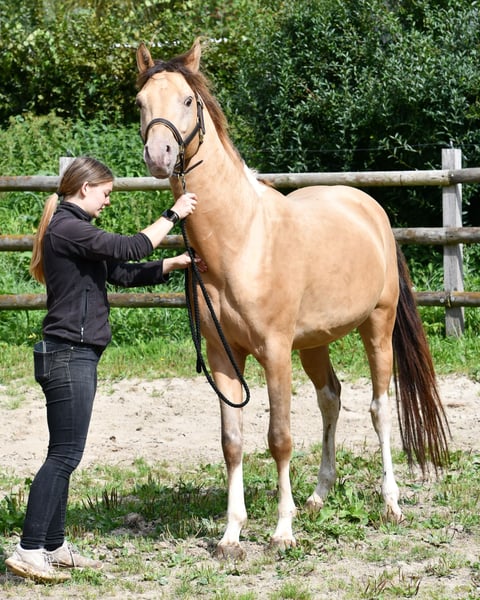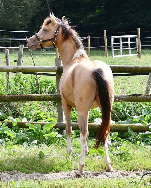 Notre Candyman est un véritable coup de cœur et quelque chose de très spécial, non seulement en raison de sa couleur champagne dorée rare et de sa minimalisme en taches, mais aussi parce qu'il impressionne par son magnifique type et ses mouvements de premier ordre. C'est pourquoi il a également été hautement récompensé, notamment avec un 9 pour son type. Nous aimerions beaucoup le voir comme cheval de famille ou également dans le sport, par exemple en endurance. Car nous sommes convaincus qu'il fera son chemin ici, étant donné qu'il provient de lignées très montables et prêtes à la performance. Les photos le montrent quelques jours après sa naissance, suivies de quelques images de sa mère et ensuite de son père.