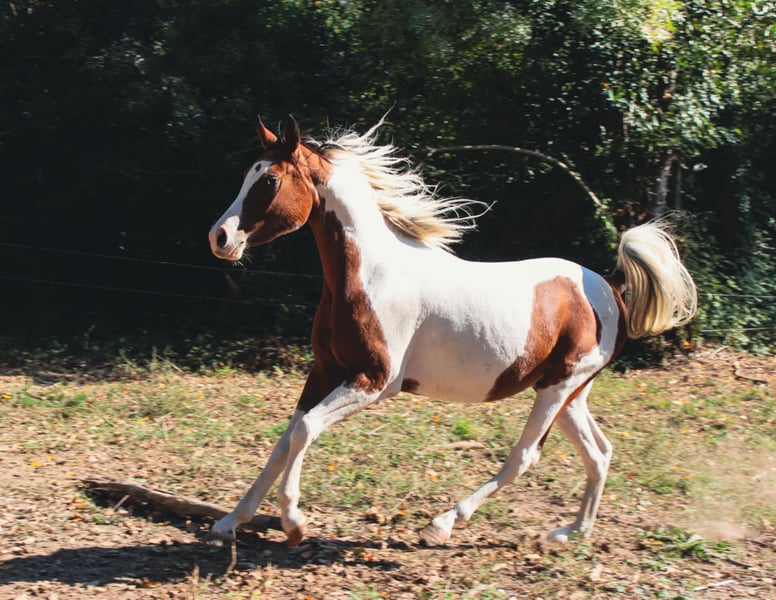 Semental de sangre mixta árabe con papeles completos, piebald tobiano "Pintabian" Tiene 3 años, muy bien manejado, gentil, tranquilo, con buena cabeza, calmado y disciplinado Se transporta en furgoneta No ha sido montado Al día con vacunas, desparasitaciones y herrado Aproximadamente 1,50 m de altura Heterocigoto para el tobiano Padre calificado en 100 km: Ismael de l'Urière Madre: Bint Nafeesah por Oulde Kercha (Horr) Disponible en junio Ubicado en Gard (30) Posibilidad de entrega