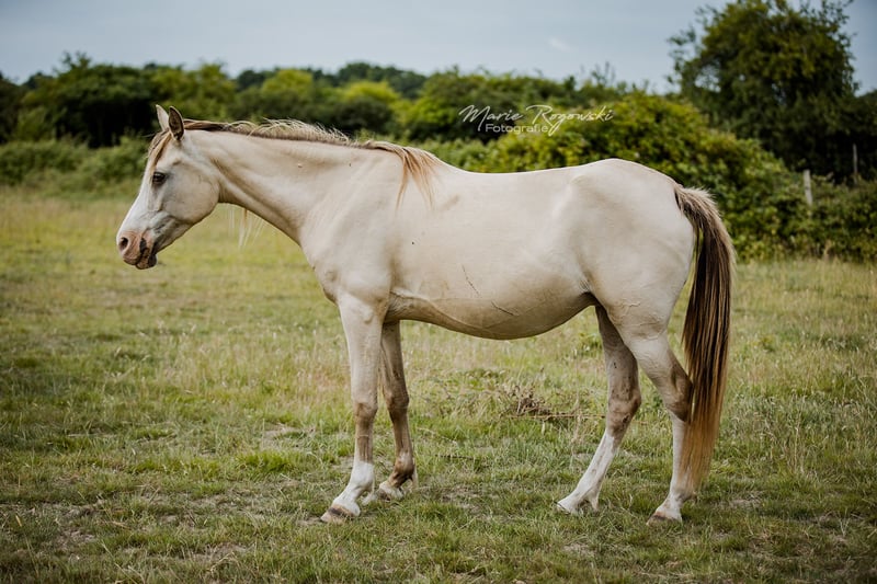 Jument arabophone (environ 93,75 % de sang arabe) Amber Champagne | née en 03/2013 | 148 cm KHREME KHARAMEL GF est une jument compacte, typée, avec une forte proportion de sang arabe et une robe exceptionnelle dans une rare teinte ambre champagne. Elle allie élégance, expressivité et une composante génétique particulière qui peut être utilisée de manière ciblée dans l'élevage. Son père, Khaffee Kharamel GF, est un étalon arabe partbred approuvé et testé sur ses performances, dont la descendance a connu le succès dans différents programmes d'élevage. Sa mère, Painted Lilo WS, lui apporte une substance et un charisme supplémentaires. Khreme n'est actuellement pas montée. Elle vit dans une écurie ouverte, est bien intégrée au troupeau et est habituée au contact quotidien avec les humains.