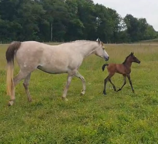 Born at the end of May 2025, AYLAN is a bay colt with typical primitive markings of the Dun gene: leg stripes, a dorsal stripe, and a cross stripe. His gaits are very light with good propulsion and amplitude. Independent, cautious, and clever, Aylan enjoys playing and shows affection when he knows the person. His pedigree suggests that he will stand around 1.55 m. Like all foals, he is handled, vaccinated, dewormed, and supplemented if necessary. Raised in a group, he will be weaned late but is available for reservation now. His price will increase with age and training progress. Several other horses are available for sale at the breeding farm, feel free to check the "Haras du Gremillon" website and contact via SMS for more information.