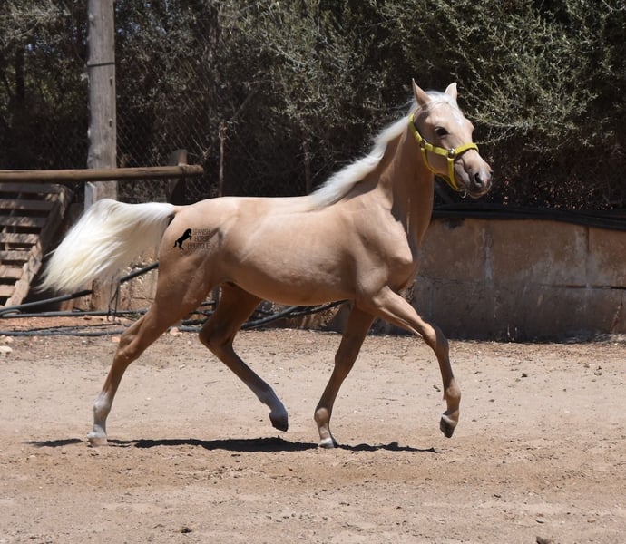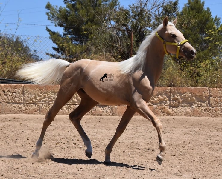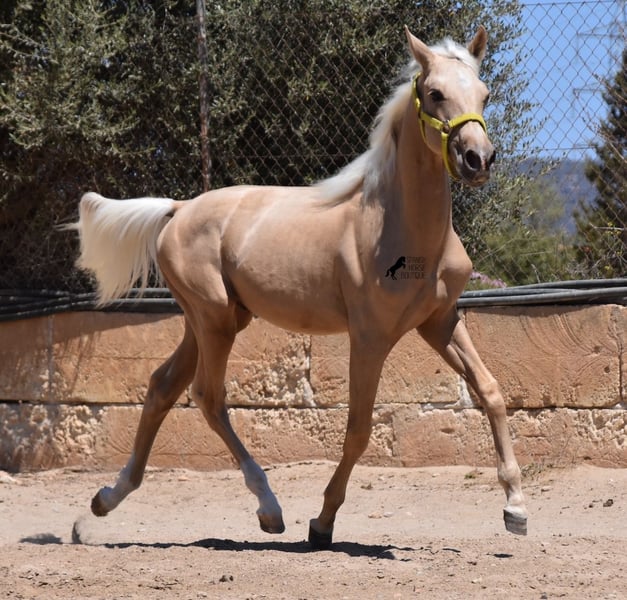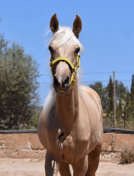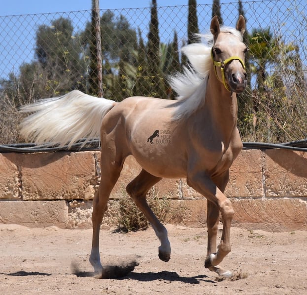 This golden treasure is very special on many levels. As an Azteca (or Aztec) he is a rarity in himself, because this wonderful breed, in his case by a Quarter dam and P.R.E. dad, does not come along very often. And then in the special color palomino, with a wonderful shimmer, what a jewel! But that's not the end of the special features, because this little rascal is already so light-footed and agile that he puts many big ones in the shade. The icing on the cake is that he is also an absolute cuddler! The breeder's daughter's favorite from birth, he's the spoiled darling, but you can't blame him for that - with his cute googly eyes, he simply wraps you around his finger straight away. When he then sweeps uphill, downhill and across the course, his already full mane in the wind, with his best movement, he definitely takes your breath away. The two white socks probably give his hind legs an extra boost, because he has very strong and agile hindquarters. On top of that, he is courageous and self-confident, typical of the breed, which will later make him predestined for working equitation, baroque riding, western and of course other disciplines. His expected final height is around 158cm and he is already chipped, so he will soon be ready to travel to your home to make your heart beat faster. He is currently in Mallorca! Videos and pedigree on request. I would be happy to organize an AKU, transport or even your trip if you come to see him in person. Details can be found on my website or in conversation. Saludos from Spain