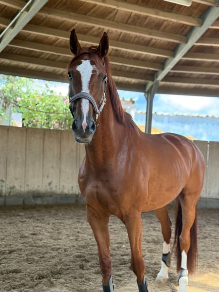 Only in the best hands. Zazu is a 2017-born chestnut gelding with a lion-hearted and mouse-hearted temperament. He is suitable for an ambitious rider who can confidently and self-assuredly guide him. In the dressage arena, he has great potential and already shows signs of his excellent pedigree. He also enjoys small jumps, although he has not been extensively trained in this discipline yet. Light cosmetic blemish on the right hind leg (superficial swelling), which does not cause any issues. — For more information, please contact us privately! — Available only to experienced and caring riders.