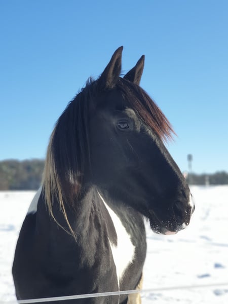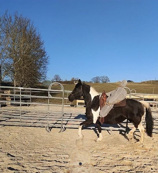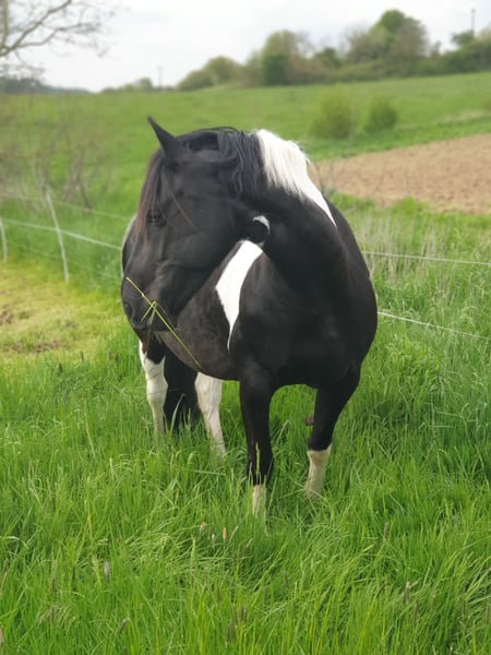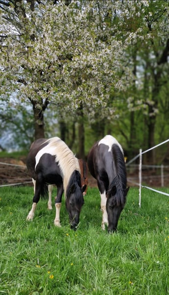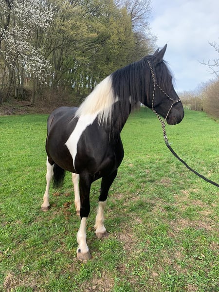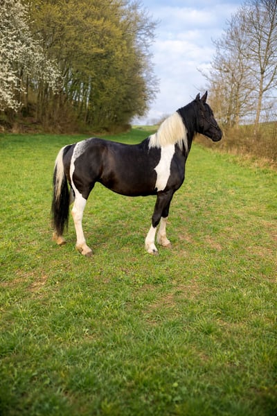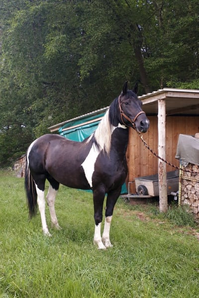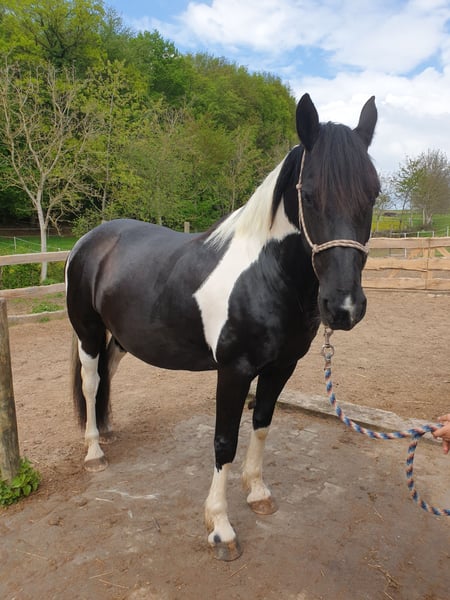 Schweren Herzens suchen wir für unsere 11-jährige Barockpinto-Stute ein neues, liebevolles Zuhause. Sie besticht durch ihren barocken Typ, ihre besondere Zeichnung und ihr sehr menschenbezogenes Wesen. Charakterlich ist sie eine verschmuste und sensible Stute, die eine enge Bindung zu ihrem Menschen aufbaut. In vertrauter Umgebung zeigt sie sich aufmerksam, freundlich und kooperativ im Umgang. Da sie eher sensibel ist, wünschen wir uns für sie einen ruhigen und souveränen Menschen, der ihr Sicherheit gibt. Ein Zuhause mit ein bis zwei festen Bezugspersonen bzw. Reitern wäre für sie ideal. Ausbildung Sie wurde schonend angeritten und bisher ausschließlich in der Halle bzw. auf dem Platz im Schritt gearbeitet. Dabei lag der Fokus auf Vertrauen, Gelassenheit und einer ruhigen Grundausbildung. Im Gelände wurde sie noch nicht geritten, war jedoch bereits mehrfach als Handpferd mit unterwegs und zeigte sich dabei aufmerksam und gelassen. Abstammung Sie besitzt Papiere und ist im Anglo European Studbook eingetragen. Die Abstammung führt über den bekannten Dressurhengst Bontfire, in dessen Linie sich auch der berühmte KWPN-Scheckhengst Samber findet. Auf der Mutterseite finden sich zudem Friesenlinien aus dem Koninklijke Vereniging Het Friesch Paarden-Stamboek, die für barocken Typ und Charakter stehen. Eigenschaften • sehr menschenbezogen und verschmust • sehr sensibel und fein auf Stimmkommandos • lauffreudig • im Herdenverband eher rangniedrig, kann bei jungen Pferden aber auch Verantwortung übernehmen • als Handpferd bereits im Gelände unterwegs gewesen • verladefromm • barhuf Sonstiges • kein Schulbetrieb • 1–2 feste Reiter optimal • keine Abgabe an Händler Sie hat ein leichtes Sommerekzem, das bei entsprechender Haltung gut zu managen ist. Bei uns zeigt es sich nur bei dauerhafter 24-Stunden-Weidehaltung ohne Unterstand – mit Zugang zu Stall oder Unterstand tritt es kaum bzw. nicht auf. Uns ist wichtig, für sie einen passenden Platz zu finden, daher geben wir sie nur in verantwortungsvolle Hände ab.