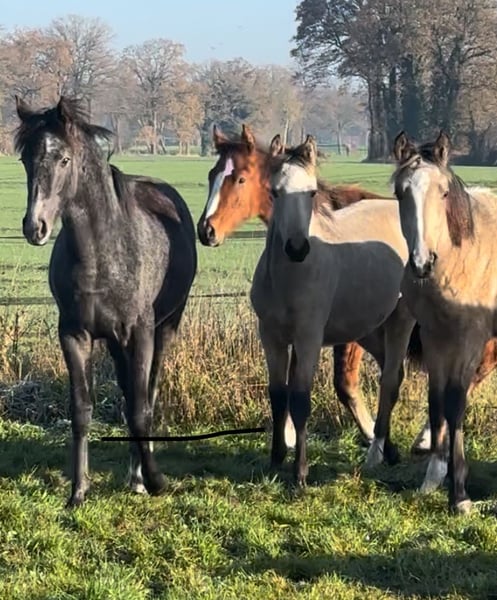 These young mares captivate with their rare buckskin color, correct conformation, and their characteristic baroque expression. They are raised in a herd environment and are age-appropriate well-behaved and easy to handle. Special color: Buckskin Registration papers available Correctly built Expressive, with a full mane The two light buckskin mares are sired by Goldberg Don Schufro. The other two are out of an Arab-Friesian mare. All are registered with the Association for Special Breeds. Prices range from €5,500 to €7,500.