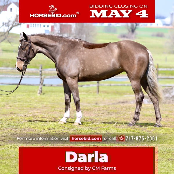 ▪️▫️◾️𝐭𝐡𝐞 𝑴𝒂𝒚 𝐒𝐞𝐥𝐞𝐜𝐭◾️▫️▪️ Happening now thru MONDAY | MAY 4th - Available EXCLUSIVELY on HorseBid's website! For more details and to register visit: www.Horsebid.com CONSIGNOR CONTACT: CM Farms 717-875-2061 LOCATION: Gap, PA BREED: Belgian/QH REGISTERED: No REGISTERED NAME: Darla COLOR: Chocolate Palomino HEIGHT: 15.2 AGE: 4 GENDER: Mare 💕 Darla — As Sweet as She Is Special 💕 Meet our girl Darla—this is one that’s been pretty easy to get attached to around here. This sweetheart is a 4-year-old chocolate palomino Belgian/QH cross standing right around 15.2–15.3hh, with all the dapples, chrome, and eye-catching color you could ask for. The girl is built a little lighter and more athletic than most, which makes her especially comfortable, balanced, and fun to ride. She’s the kind that gets noticed, but it’s her personality that really keeps you hooked. Darla has been brought along the right way, and it shows in everything she does. She’s soft, willing, and very in tune with her rider. This mare neck reins, direct reins, and moves off your leg with ease, and she’s got a nice handle to her already. The feel she gives you is what people spend years looking for—light in your hands, responsive, and always trying to do the right thing. We’ve been putting some time into her English and dressage work, and she’s taken to it like a natural. The girl has a pretty way of going, stays rhythmic, and carries herself nicely. We’ve also started her lightly over fences, and this little mare has been honest, brave, and just plain fun. She even made her first trip to a schooling show and came home with ribbons, handling the whole experience like a seasoned horse. Out on the trail, she’s just as dependable. This sweetheart is the same whether you’re at home or somewhere new. She’s been through rough terrain, water, woods, and even ridden into town with traffic and noise, and nothing seems to shake her. She’ll lead, follow, or just quietly go along—whatever you ask of her. She’s also been through our desensitizing program and has seen tarps, flags, smoke, dogs, and equipment. The girl takes it all in stride and keeps a level head. Around the barn, she’s just a pleasure to have—easy to catch, stands quietly, enjoys being groomed, and gets along well turned out. No bad habits, no drama—just a good-minded young mare. Darla is one of those you find yourself looking forward to riding. She’s kind, willing, and meets you in the middle every time. This is a mare you can enjoy right now, but she’s also the kind that’s only going to keep getting better and more valuable with time. We’d love to see this girl go on and be someone’s go-to partner—the kind you reach for whether it’s the show ring, a long trail ride, or just a relaxing day at the barn. 📍 Gap, PA 🎥 Full video available 🚚 Nationwide shipping available 💰 Serious inquiries only. Horses like this don’t come along often, and we think a lot of this one. like this are not easy to come by, and she is priced accordingly.