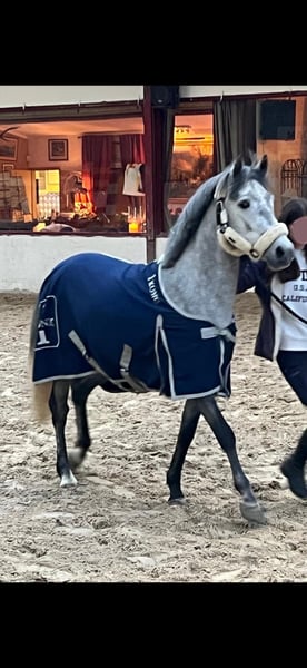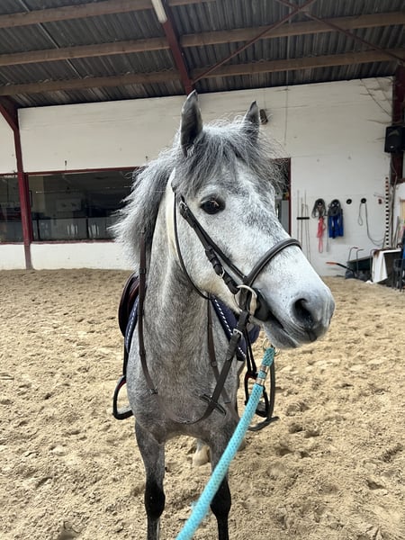 Jonge pony, zeer vriendelijk. Alleen of gezelschap tijdens een wandeling, zeer vriendelijk. Klaar voor parcours van 70/80 cm. Groen, maar leert snel.