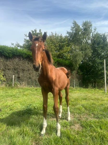 Charlie Ter Fosse ist ein vielversprechendes Hengstfohlen aus Vivana Ter Fosse (v. Orleans van de Kruishoeve) und Pedro Sitte (Quabri de L’Isle). Diese Kombination vereint einige der einflussreichsten Springlinien der Gegenwart. Pedro Sitte ist ein junger, vielversprechender Hengst und Sohn des Olympioniken Quabri de L’Isle. Seine Mutterlinie ist ebenso stark: Katona Sitte ist eine Tochter von Old Chap Tame (v. Carthago), der selbst auf höchstem Niveau aktiv war und die Nations Cup in Aachen gewonnen hat. Über die Großmutter Estrella Sitte (v. Ogano Sitte) führt die Linie direkt zurück auf Ustina Sitte (v. Clinton), die international erfolgreich mit Olivier und Nicola Philippaerts war. Die berühmte Sitte-Linie hat zudem zahlreiche Grand Prix-Pferde hervorgebracht, darunter Dayton, Baltik, Exotik und Button Sitte. Die Mutter Vivana Ter Fosse stammt von Orleans van de Kruishoeve ab, der selbst auf 1,55 m-Niveau mit Reitern wie Neri Pieraccini, Thibault Philippaerts und Robin Van Thillo erfolgreich war. Orleans ist ein Sohn von Fantomas de Muze und Jeanne d’Arc van de Kruishoeve, die wiederum von Vagabond de la Pomme abstammt. Diese Linie hat sich international als erfolgreich erwiesen, mit Nachkommen, die auf 1,60 m-Niveau Leistungen zeigen. Vivana stammt aus einer Linie mit klaren schwedischen Warmblut-Einflüssen über Caiza (v. Brabant) und Kalla (v. Lansiar). Diese Zuchtlinie hat mehrere Sportpferde hervorgebracht und ist bekannt für Temperament, Nützlichkeit und Reitbarkeit. Vivana kombiniert somit die Sportqualitäten der skandinavischen Zucht mit dem modernen Springtyp aus der belgischen und niederländischen Zucht. Mit diesem Hintergrund verfügt Charlie Ter Fosse über moderne Springgene, bewährte Sportleistungen und eine Stutenlinie, die ihren Wert in Belgien, den Niederlanden, Deutschland und Schweden unter Beweis gestellt hat. Eine Investition mit Sicherheit sowohl im Sport als auch in der Zucht. *Der Pass wurde beantragt und befindet sich noch in Bearbeitung beim Zuchtverband, bitte rechnen Sie mit möglichen Verzögerungen.