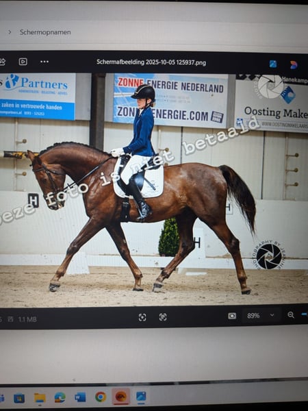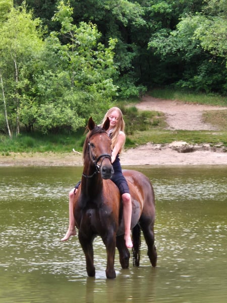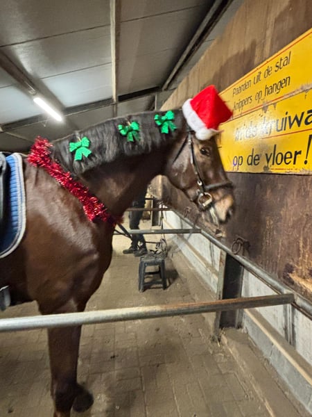 Hierbij verkoop ik na lang wikken en wegen mijn paard. Hij is 1,74 hoog maar doordat hij laat geruind is wat grover qua bouw. Hij is dressuurmatig gereden en dit jaar uitgebracht in de B klasse met 3 wp. Maar mijn hart blijft toch bij het springen liggen vandaar dus de verkoop. Qua inentingen op orde, net als de tandarts. Elk jaar komt de osteopaat maar die kan eigenlijk niks doen want krijg elk jaar te horen: Hij zit los in het vel. Om de 8 weken komt de hoefsmid. Is ontwormt. Staat op dit koment voor op ijzers maar zou ook blootsvoets kunnen. Is erg schoon in de stal, doet alles op 1 plaats. Je kan hem alleen laden, loopt zo de trailer op. Ook in donker en je kan zelfs de verlichting uitlaten. Hij kan mee op buitenrit, ook alleen. Kan dan soms wat spannend vinden maar na enige overtuiging loopt hij door. Heb met hem WE gedaan, ook dat vind hij leuk om te doen. Door zijn brede rug en rustige galop zou hij ook geschikt kunnen zijn voor voltige.