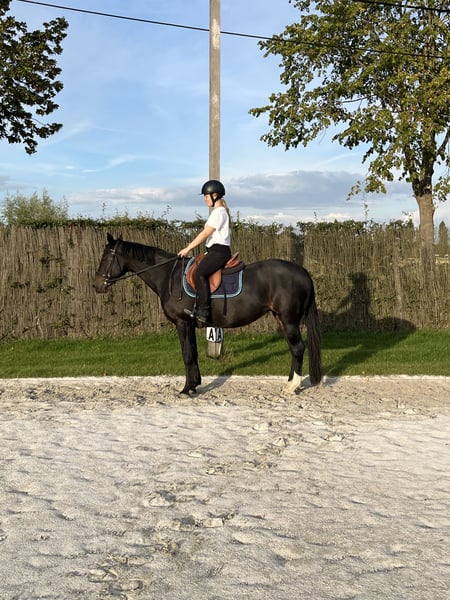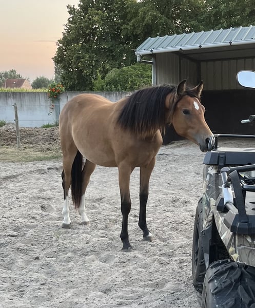 Voici la traduction en français : --- Très joli poney familial (fille de Voltaire) recherche une famille 5⭐️ 🏡. Elle a 16 ans. Elle nous a rejoint en tant que yearling. À 3 ans, elle a été approuvée RX 🩻 ✅. Elle a été monté en selle à 4 ans. Par la suite, j’ai participé à des concours de saut d’obstacles avec elle. Elle sautait très régulièrement, avec de nombreux classements en 90/1m 🏅. Elle a également parcouru des parcours jusqu’à 1,15 m avec d’autres chevaux, en raison de mon âge, mais on remarque que la distance en double devient un peu plus difficile (oxer -> ligne droite sans problème, ligne droite -> oxer plus difficile). Elle est très fiable, ne fait jamais de fautes. Elle est également 100 % habituée à la circulation. Se promener (forêt, plage, route) lui plaît énormément ! 🤩 Elle s’adapte parfaitement à son cavalier. Elle donne confiance à un cavalier débutant, et pour un cavalier de concours, elle donne toute son énergie pour gagner. Elle ne rechigne pas à être rasée ou à être transportée. Chez nous, elle a donné naissance à 3 poulains, dont le plus jeune arrivera en 2026. Elle transmet son caractère et ses qualités à ses descendants. Le premier est vendu aux Pays-Bas. Les deuxième et troisième sont encore en notre possession (voir dernières photos). Elle se trouve en Belgique 🇧🇪.