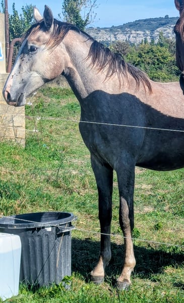Puledro Barbe con temperamento eccezionale. Di grande dolcezza e estremamente facile in tutto. Ben educato, sa camminare al passo, fare passeggiate, superare ostacoli e dispositivi, caricare e viaggiare serenamente, ecc. Bellissima conformazione molto equilibrata, splendida locomozione. Misura circa 1,50 m a 18 mesi, dovrebbe arrivare a circa 1,55 m.